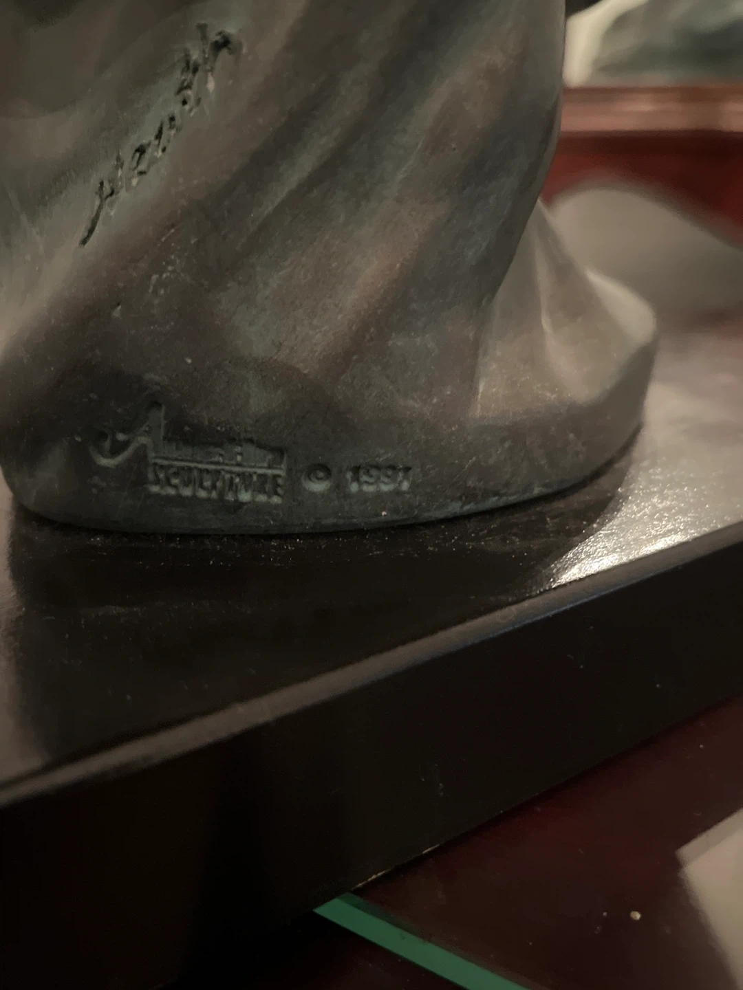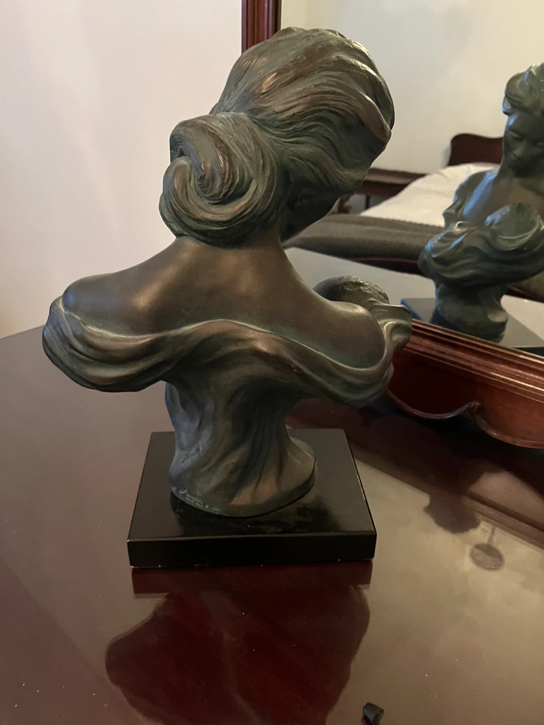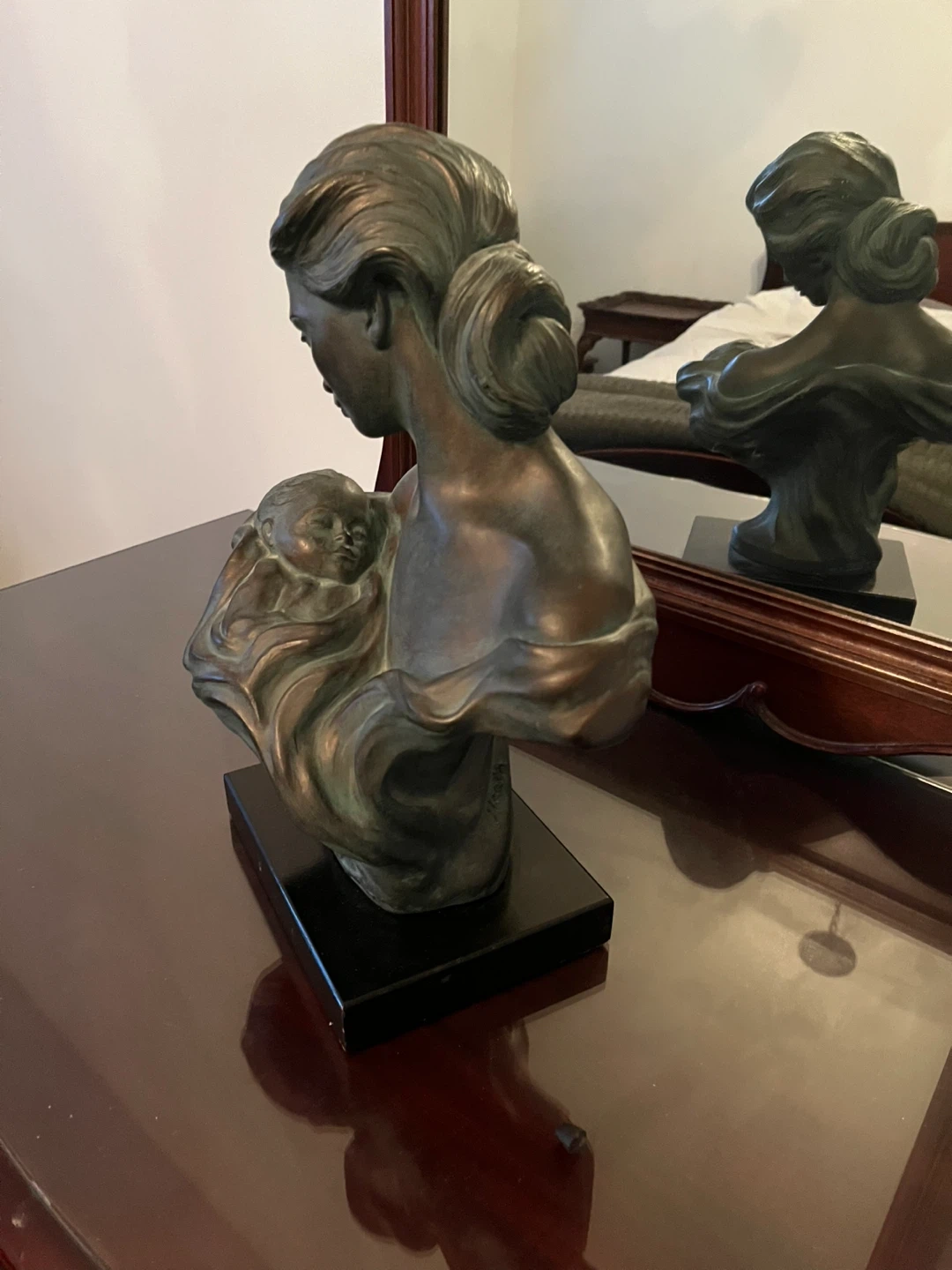 This is a bronze-finished bust sculpture depicting a mother holding her child. It's mounted on a black base. It's a beautiful piece of art for any home. Signed Augustine