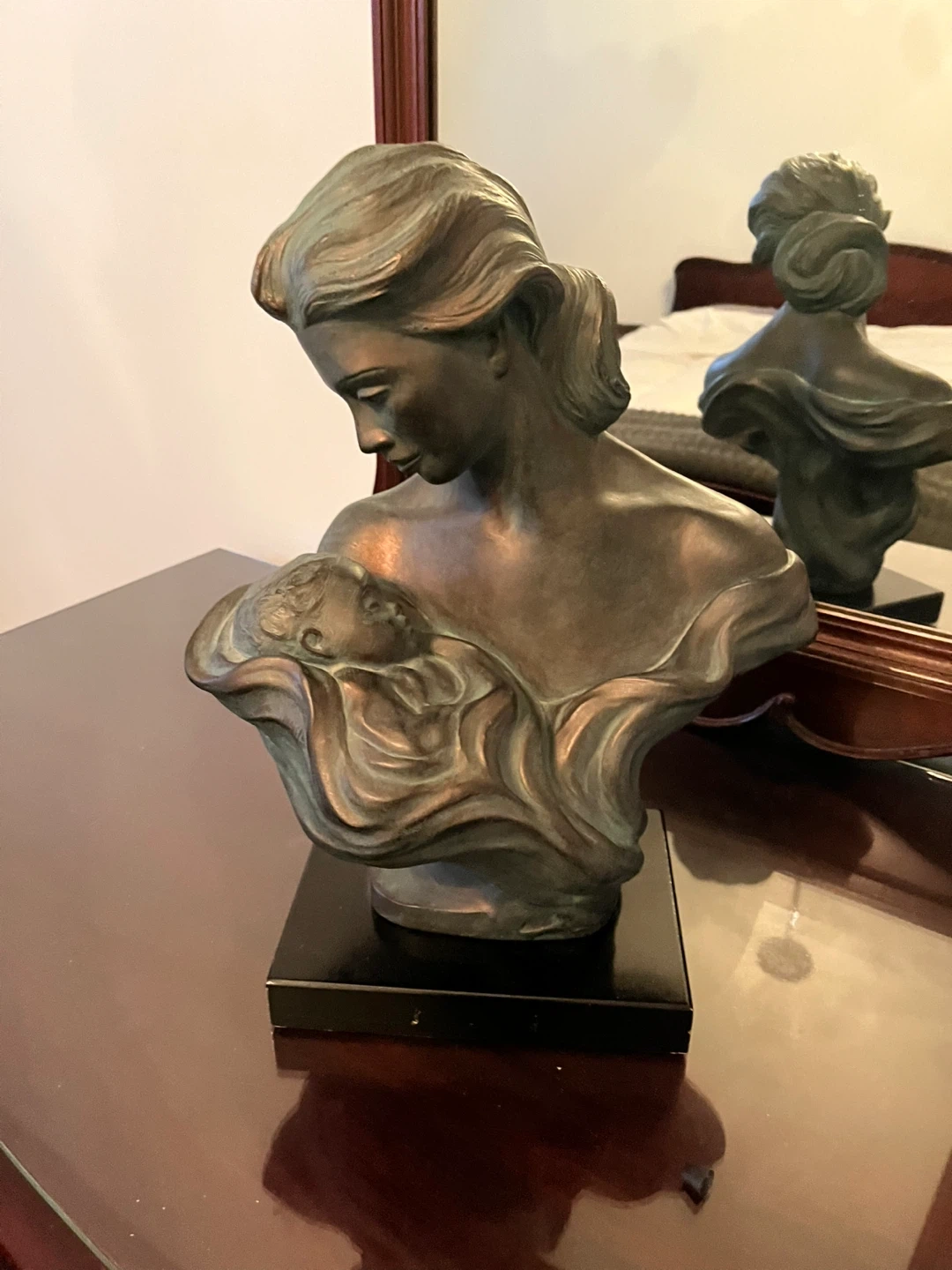 This is a bronze-finished bust sculpture depicting a mother holding her child. It's mounted on a black base. It's a beautiful piece of art for any home. Signed Augustine