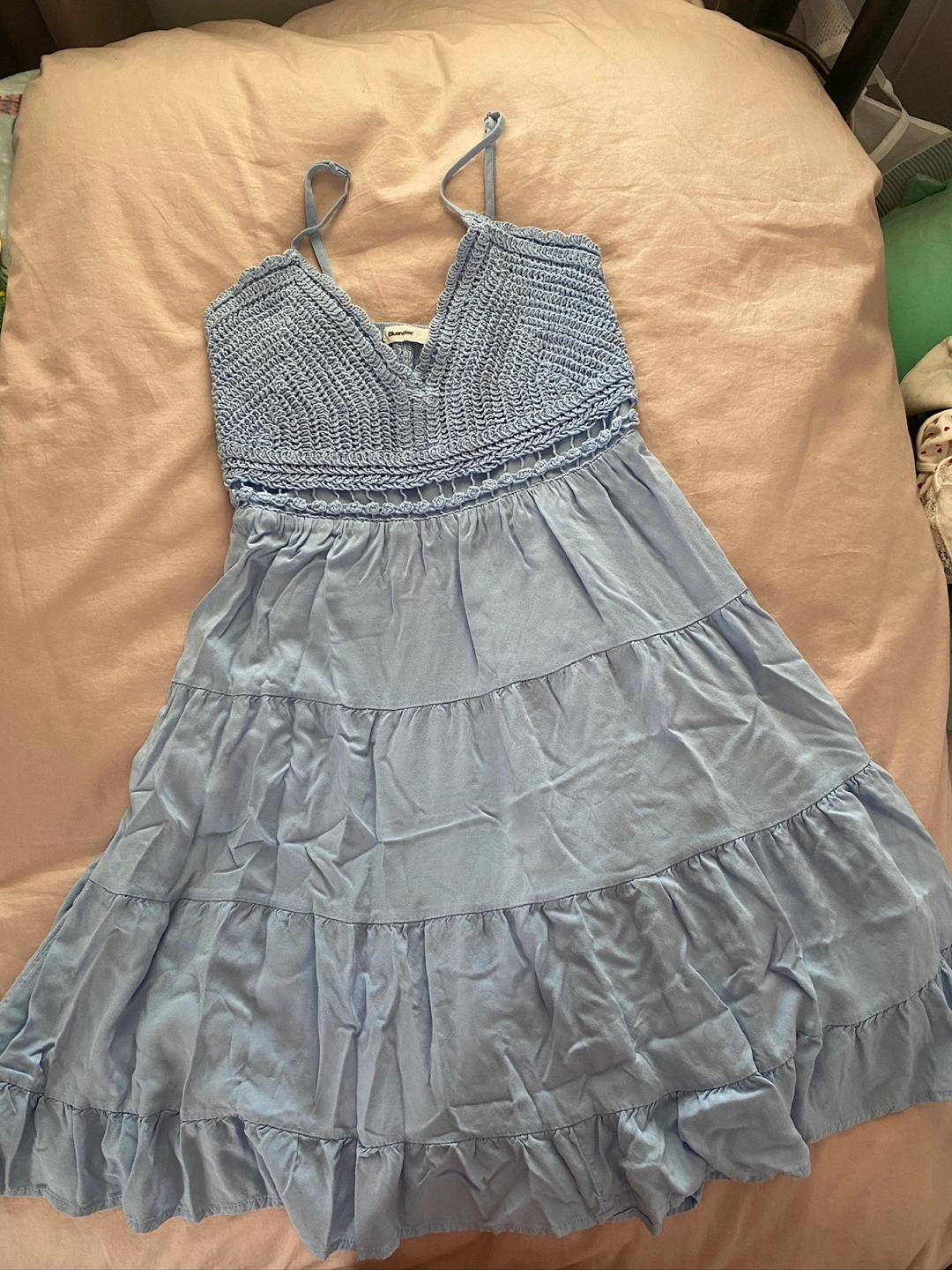Blue crochet dress with a tiered skirt and a V-neckline. It has adjustable straps and a crochet bodice.
