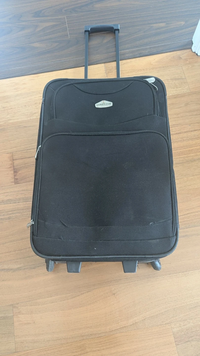 Black fabric rolling suitcase by Cambridge. It has a telescopic handle and wheels for easy transport. Interior has tie-down straps and zippered compartments.