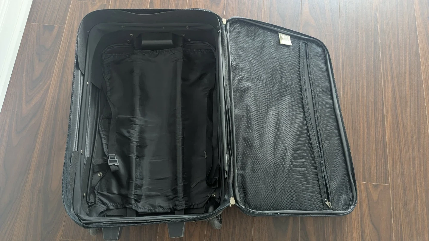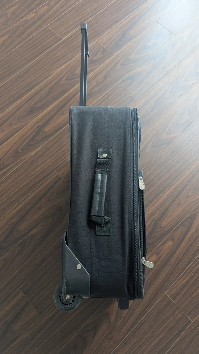 Black fabric rolling suitcase by Cambridge. It has a telescopic handle and wheels for easy transport. Interior has tie-down straps and zippered compartments.