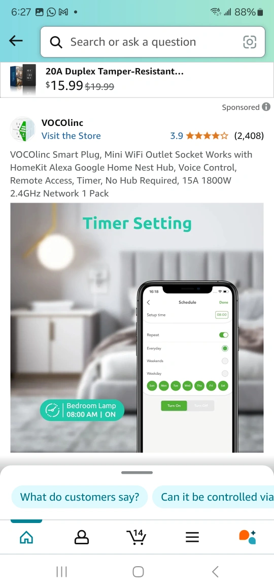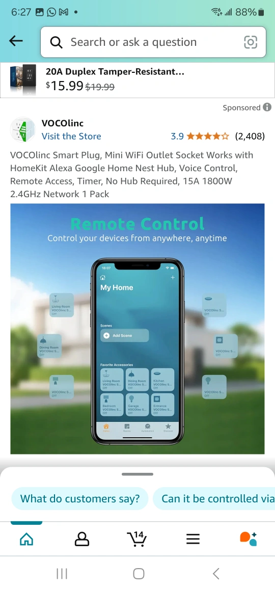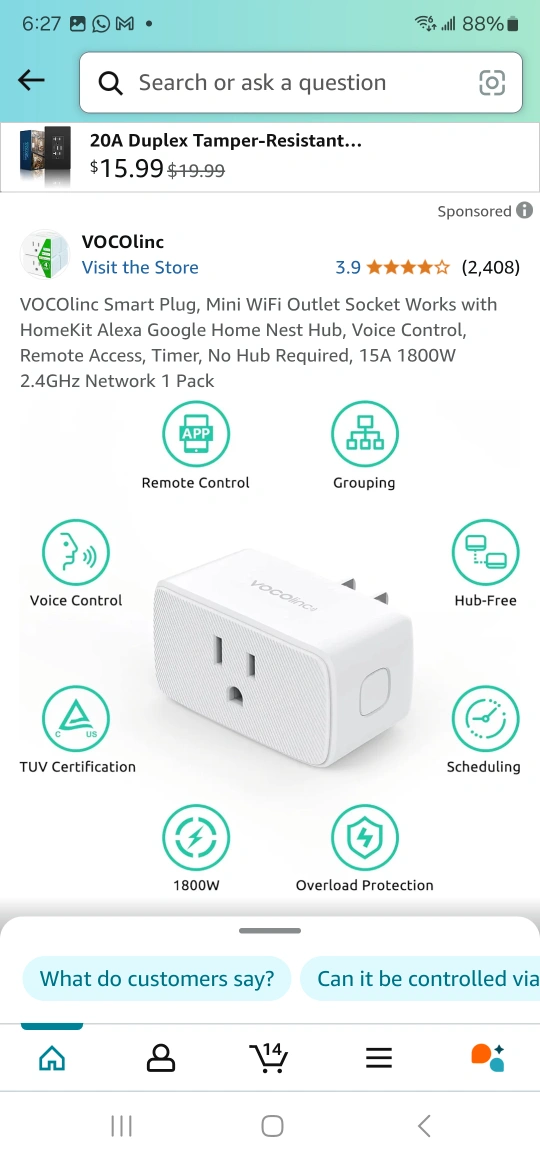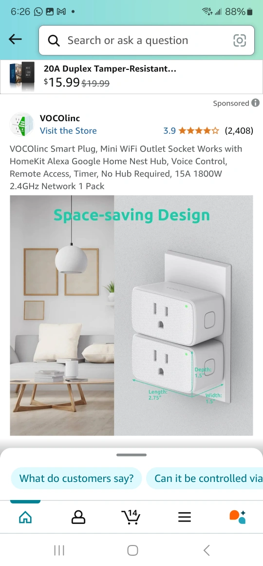 2-pack VOCOlinc Smart Plugs. Mini WiFi outlet. Works with HomeKit, Alexa, Google Home, Nest Hub. Voice control, remote access, timer. No hub required. 15A 1800W. 2.4GHz network.