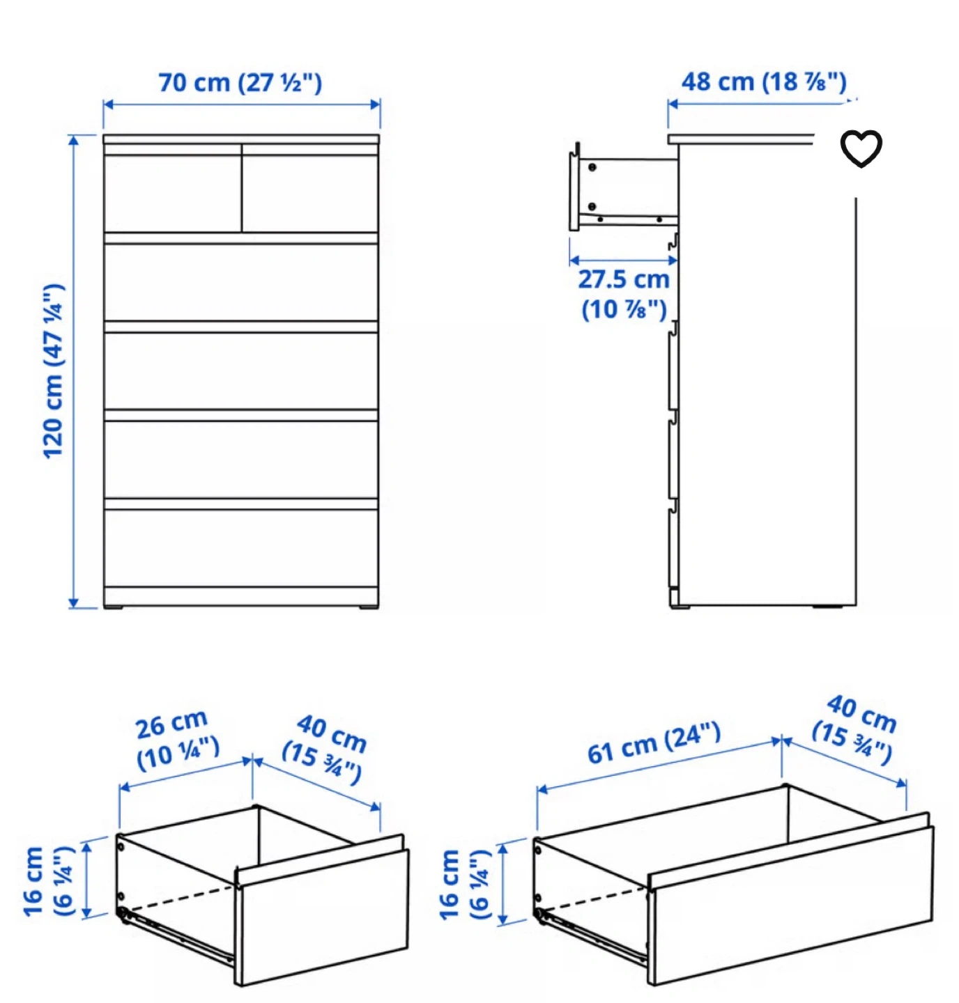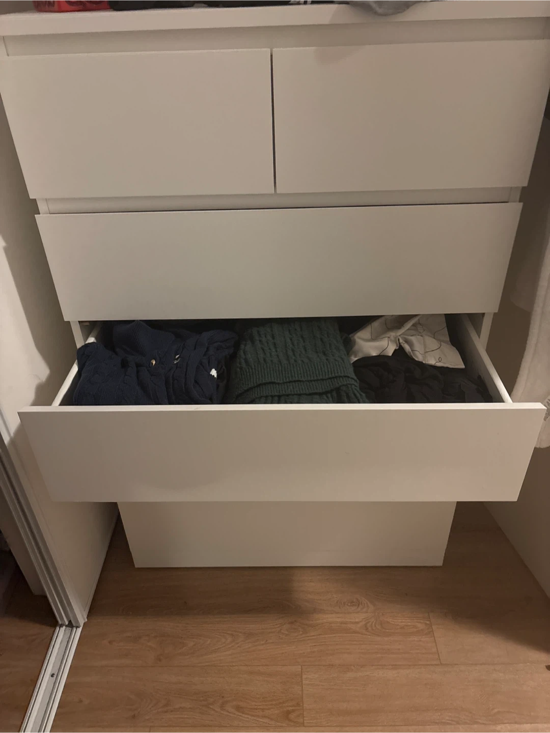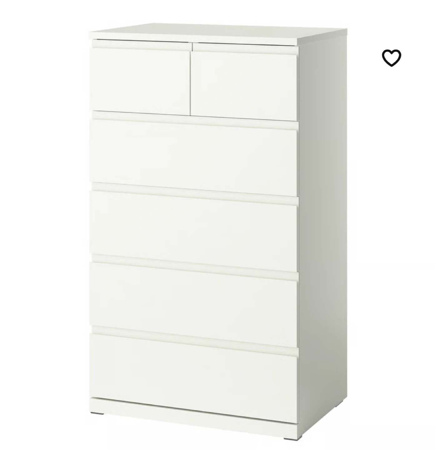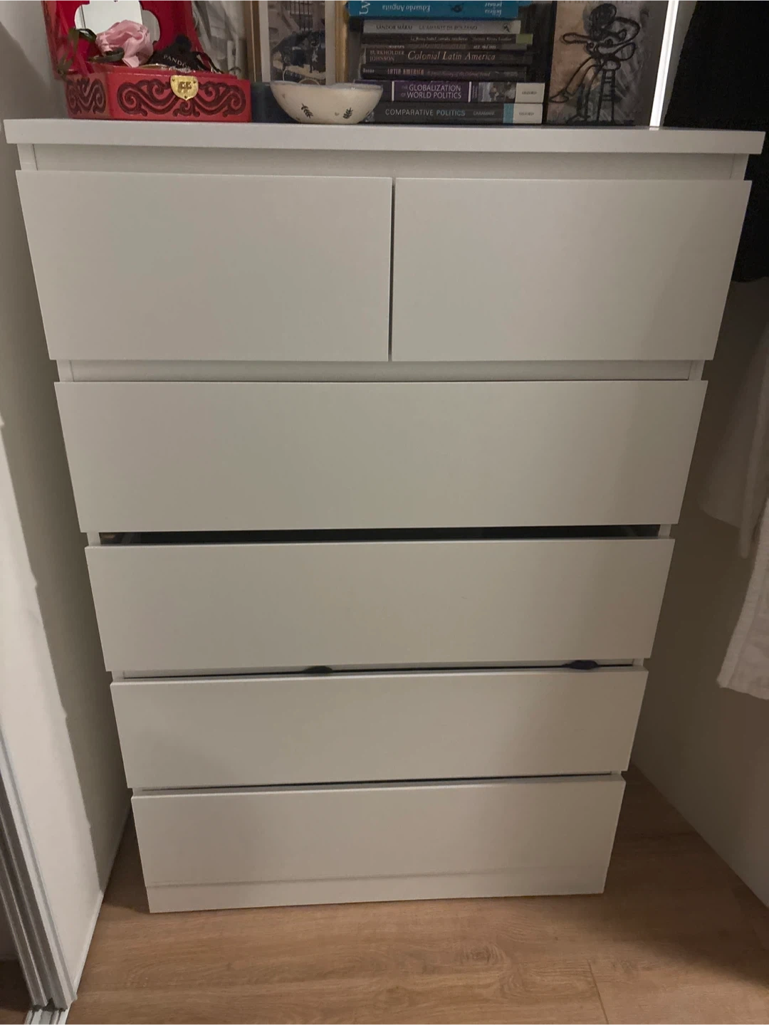 White IKEA MALM 6-drawer dresser. Dimensions are 120 cm (47 ¼") high, 70 cm (27 ½") wide, and 48 cm (18 ⅞") deep. Large drawers measure 61 cm (24") wide and small drawers measure 26 cm (10 ¼") wide. This dresser is great for storing clothes and linens.