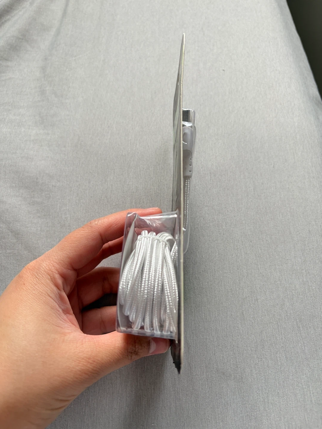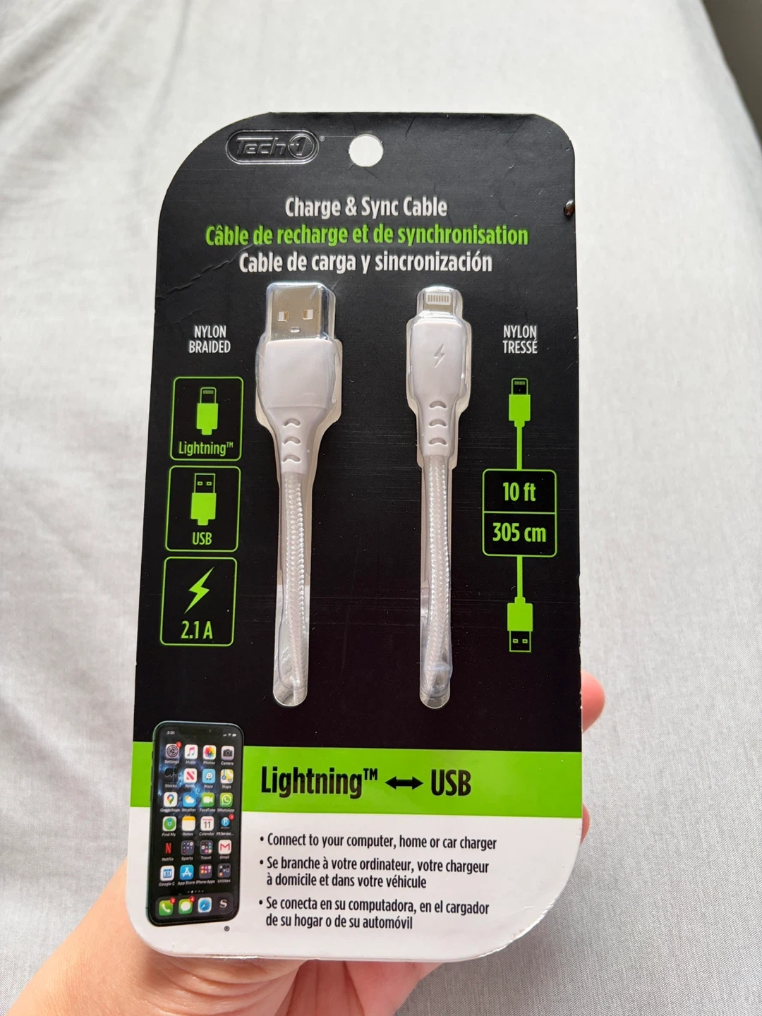 This is a Techpro 10 ft (305 cm) Lightning to USB charge and sync cable. It's made with nylon braided material and supports 2.1A charging. Connect it to your computer, home or car charger.