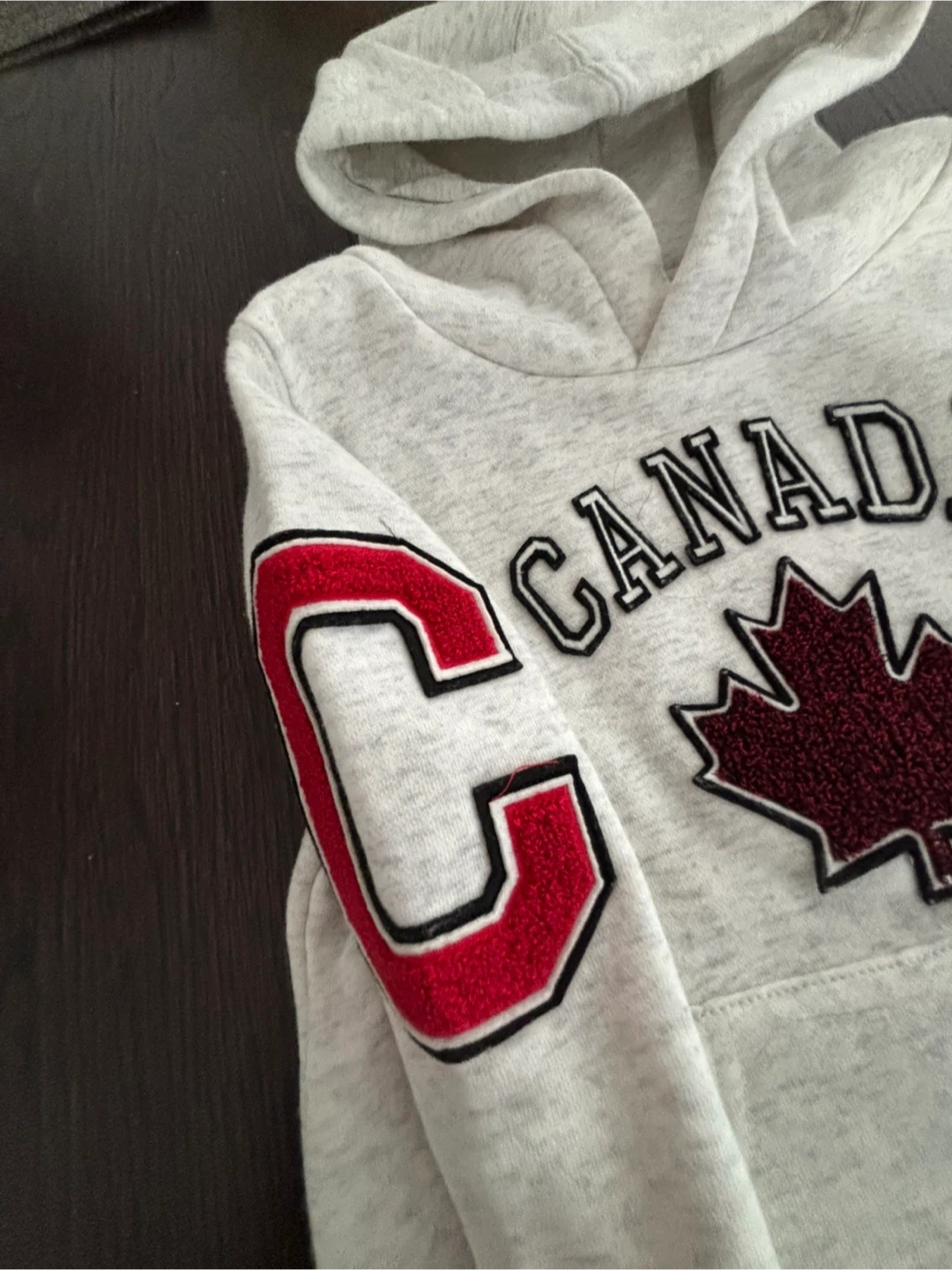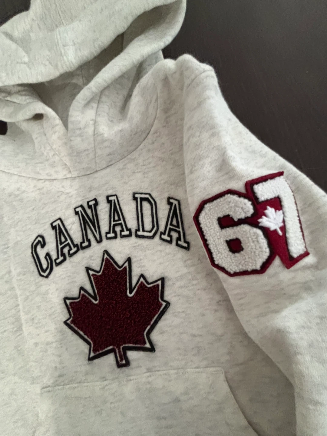 Child size 2/3. Grey heathered hooded sweatshirt with 'CANADA' and a maple leaf graphic on the front. Features applique 'C' and '67' on the sleeves. Ribbed cuffs and hem with red and white stripes. This hoodie is comfy and stylish!