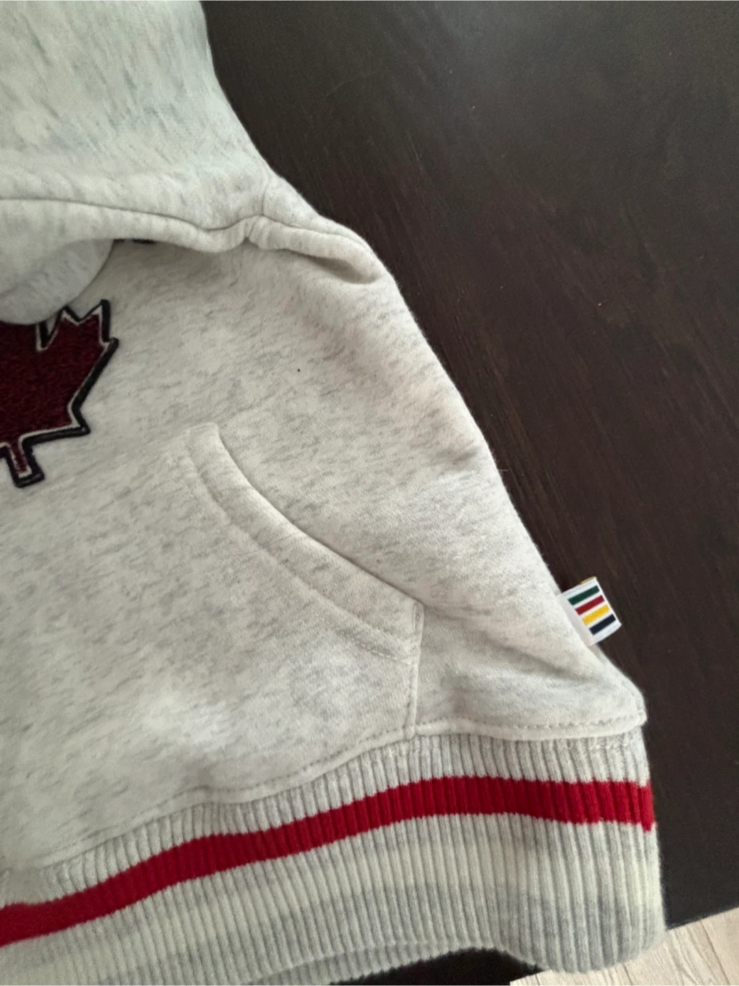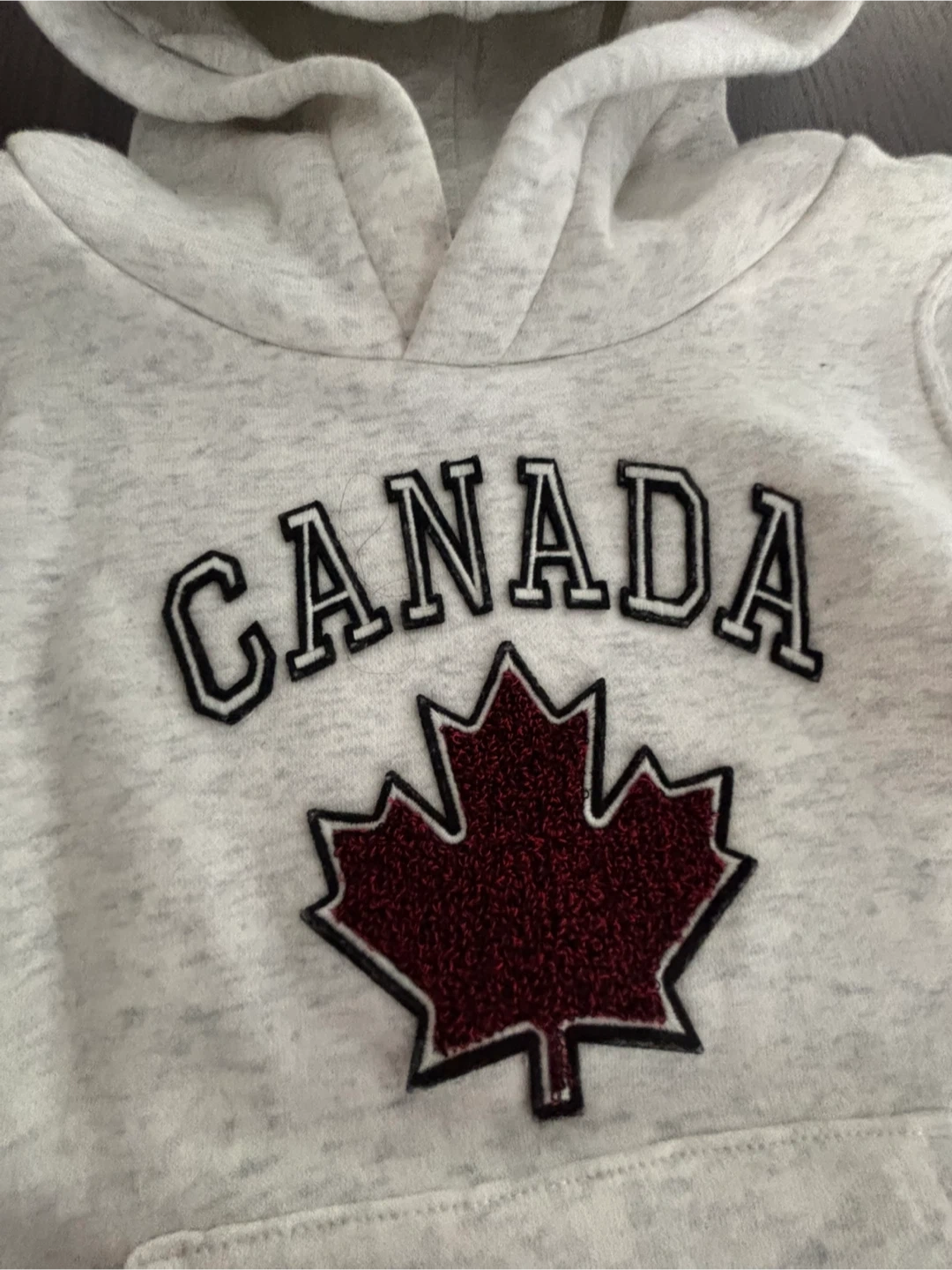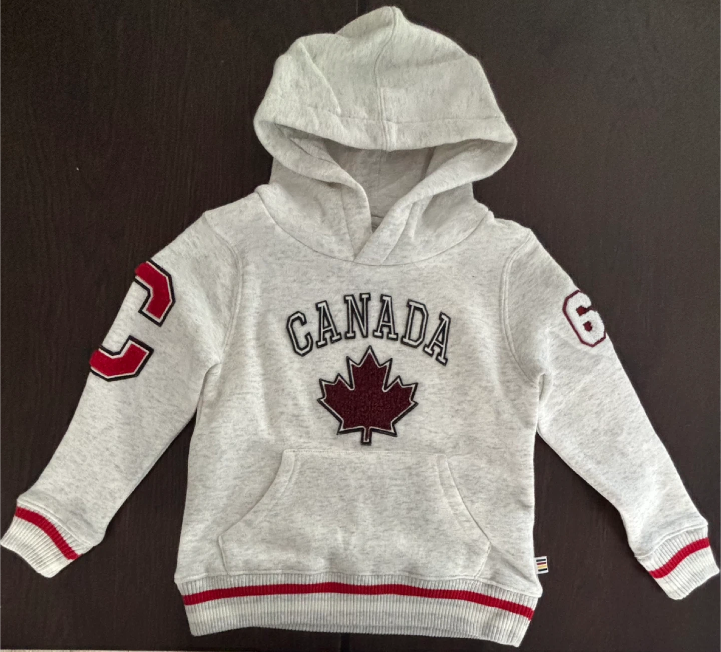Child size 2/3. Grey heathered hooded sweatshirt with 'CANADA' and a maple leaf graphic on the front. Features applique 'C' and '67' on the sleeves. Ribbed cuffs and hem with red and white stripes. This hoodie is comfy and stylish!