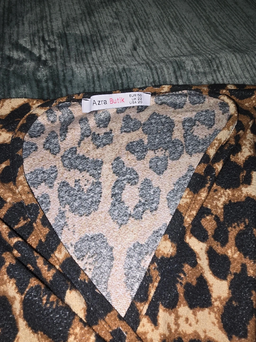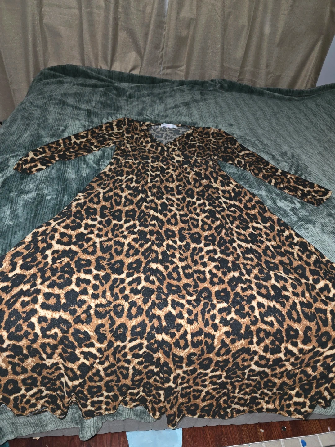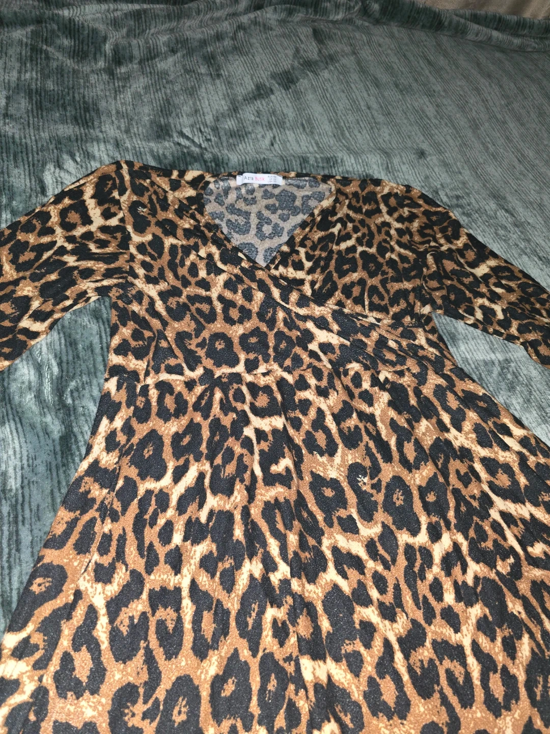 This Azra Butik dress features a classic leopard print and a flattering wrap style. It's designed with long sleeves and a comfortable fit. The dress is a size 10, perfect for casual outings or dressing up!