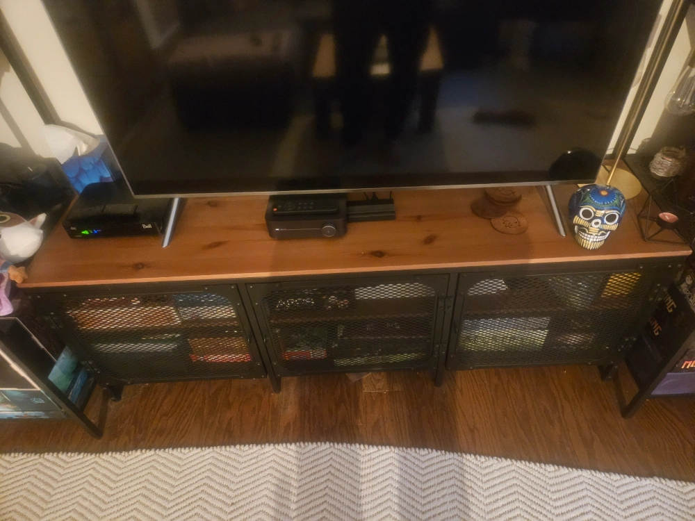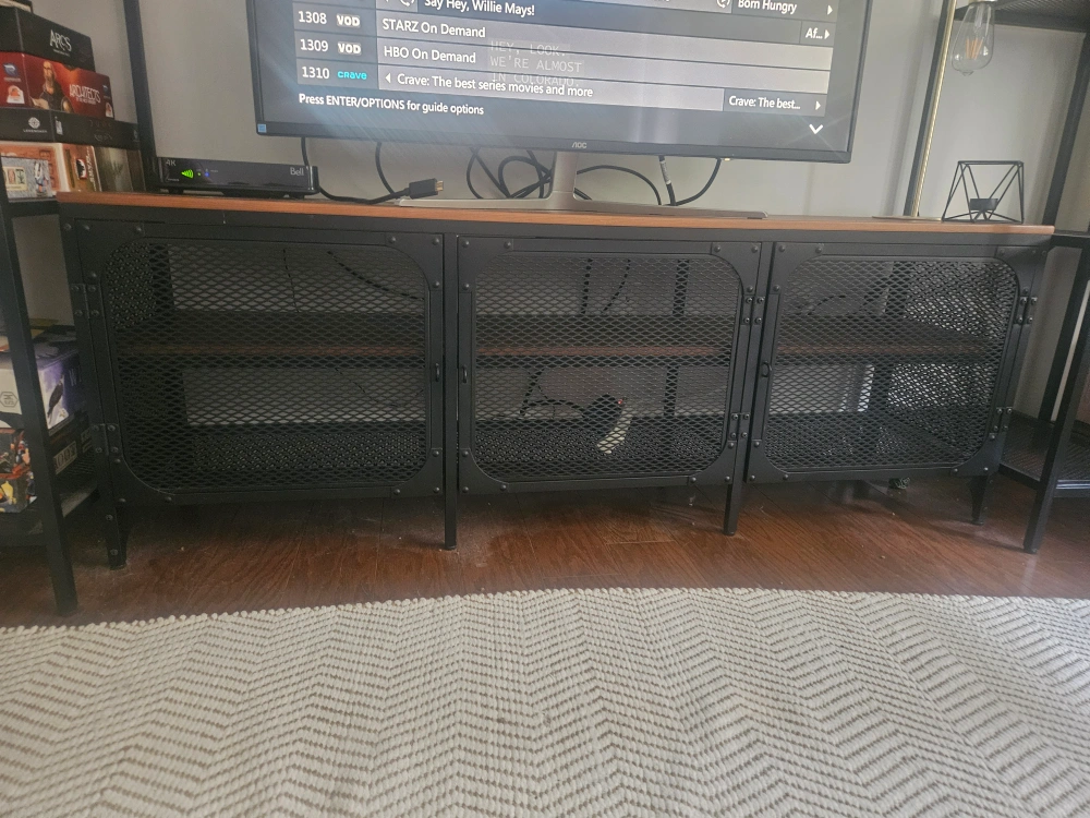 Selling a FJALLBO TV stand with a wooden top and metal mesh doors. It offers ample storage space behind the mesh doors, perfect for organizing your media devices and accessories. A stylish and functional addition to any living room!