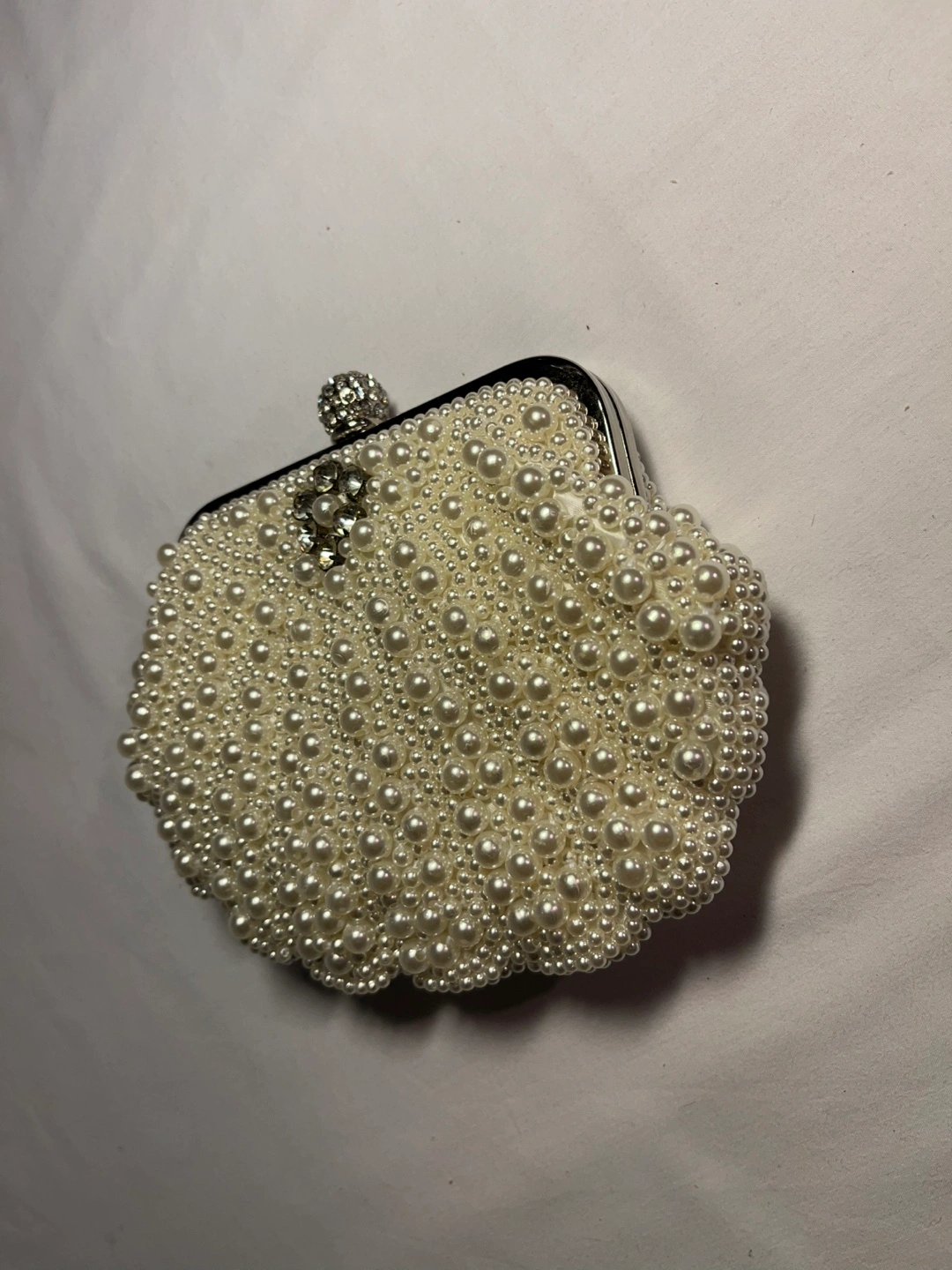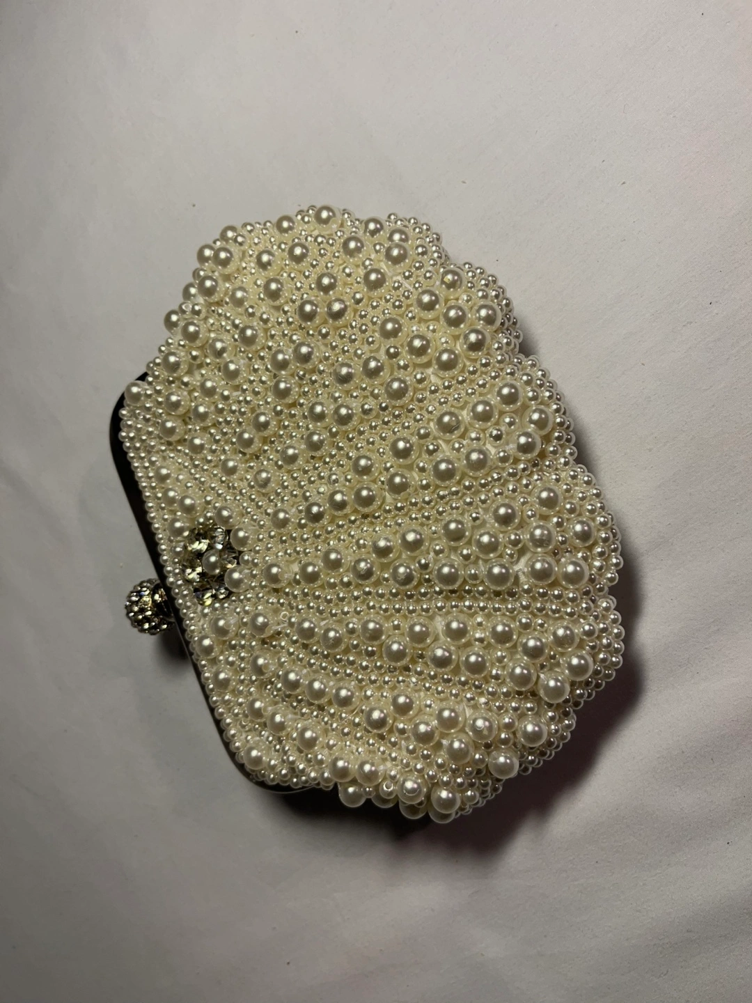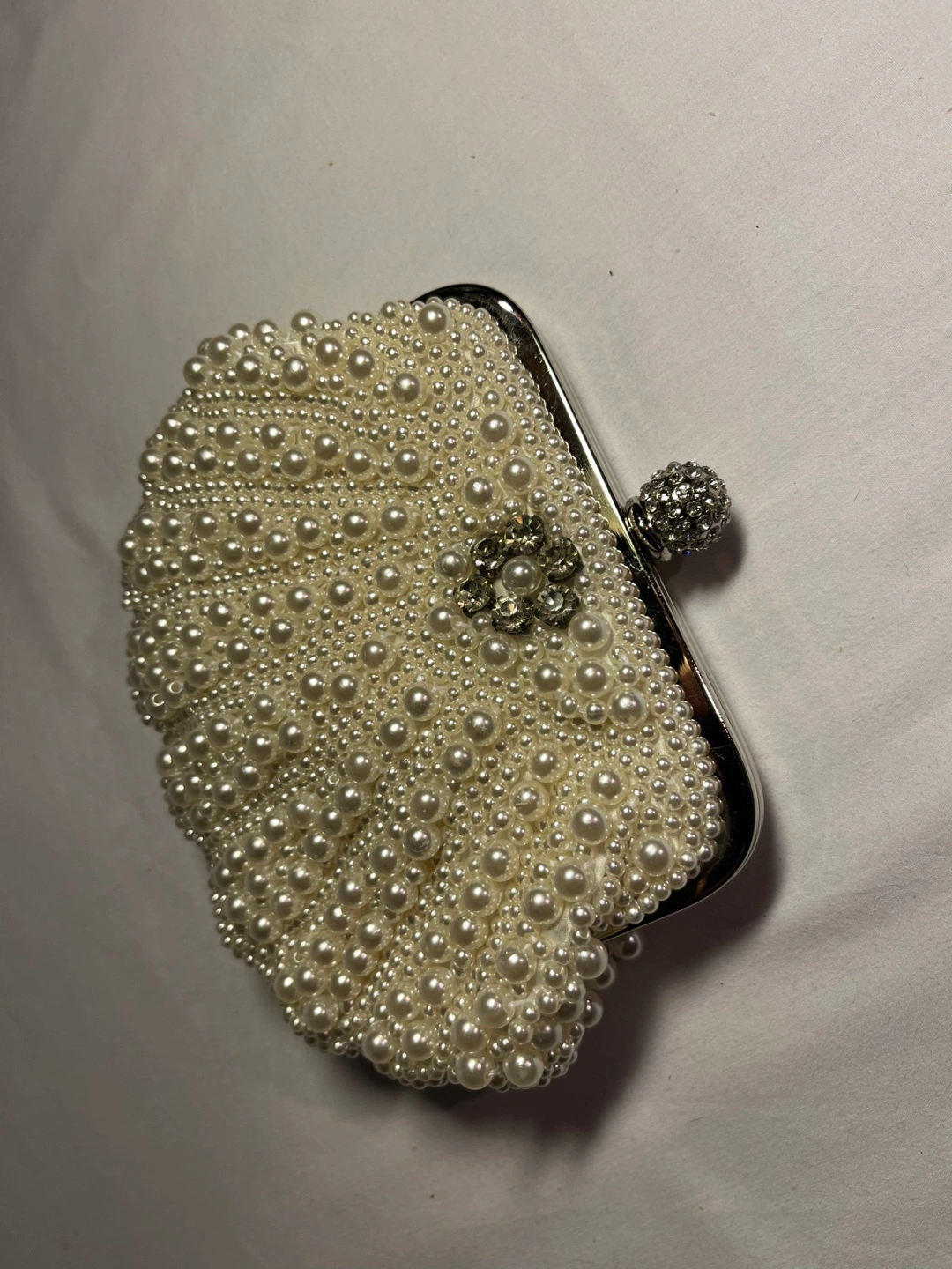 This is a beautiful pearl beaded clutch bag! It's perfect for a special occasion or just to add a touch of elegance to your outfit. It has a silver-tone frame and a clasp closure. The bag is in great condition and ready to be used!