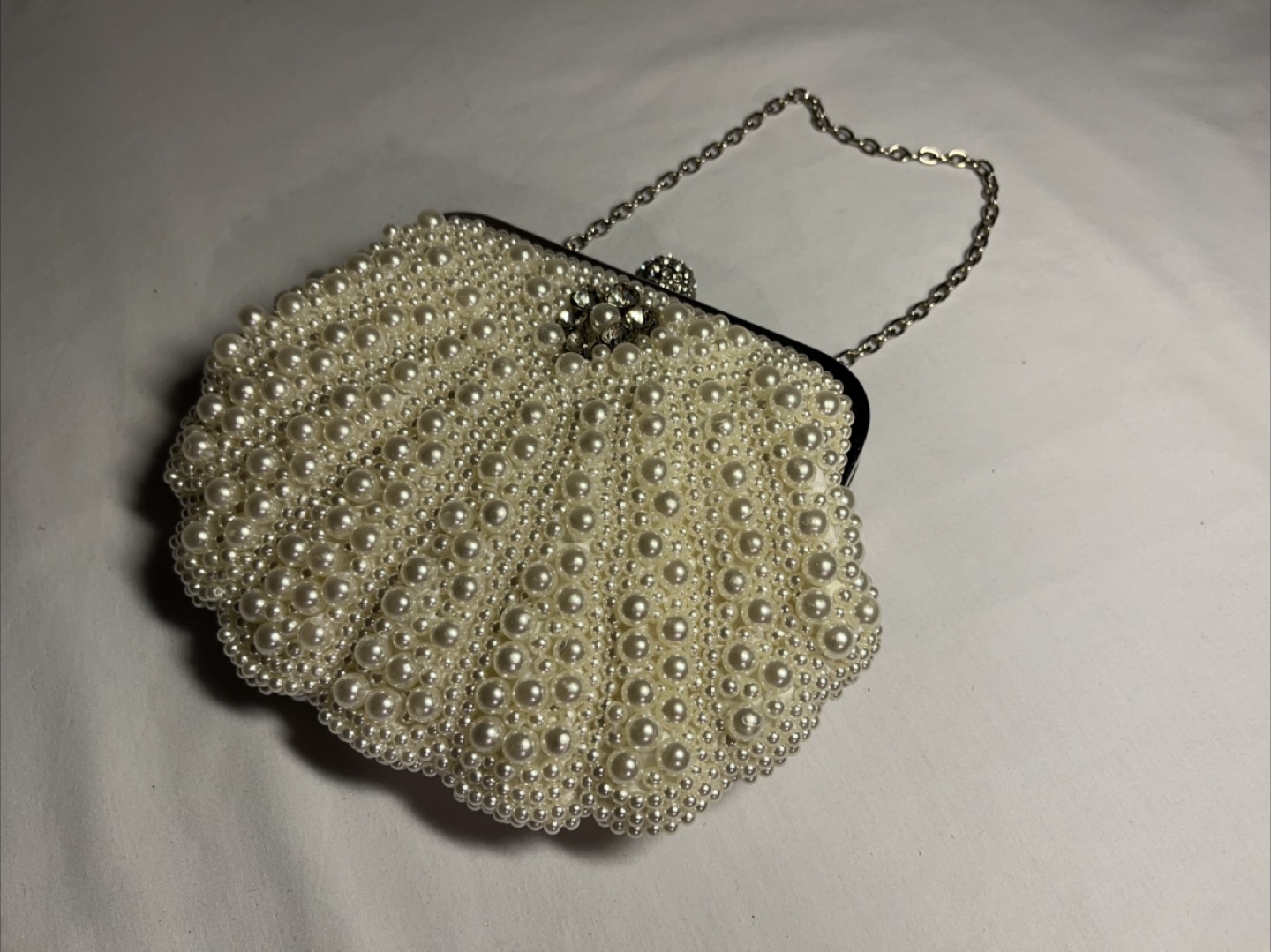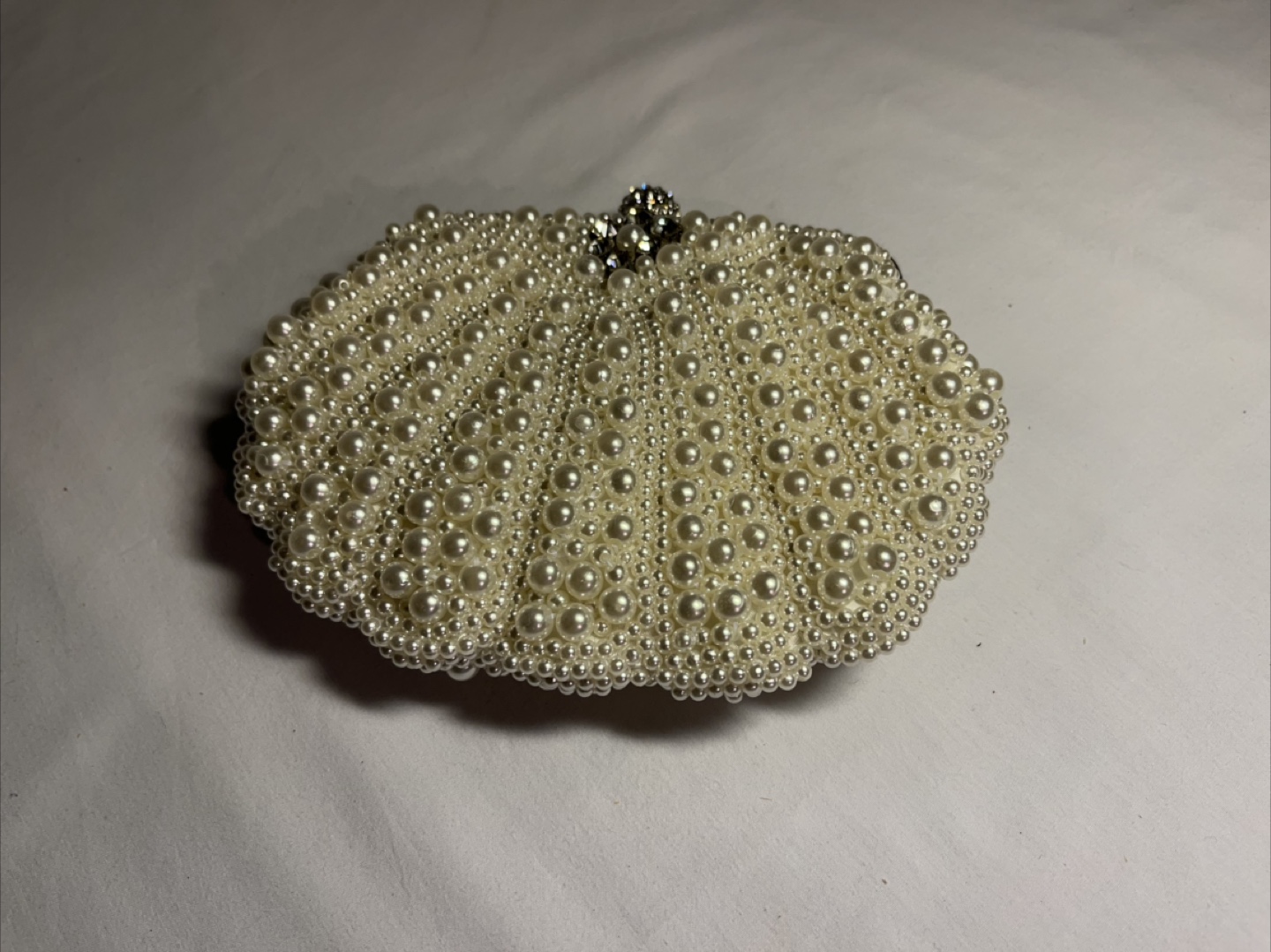 This is a beautiful pearl beaded clutch bag! It's perfect for a special occasion or just to add a touch of elegance to your outfit. It has a silver-tone frame and a clasp closure. The bag is in great condition and ready to be used!