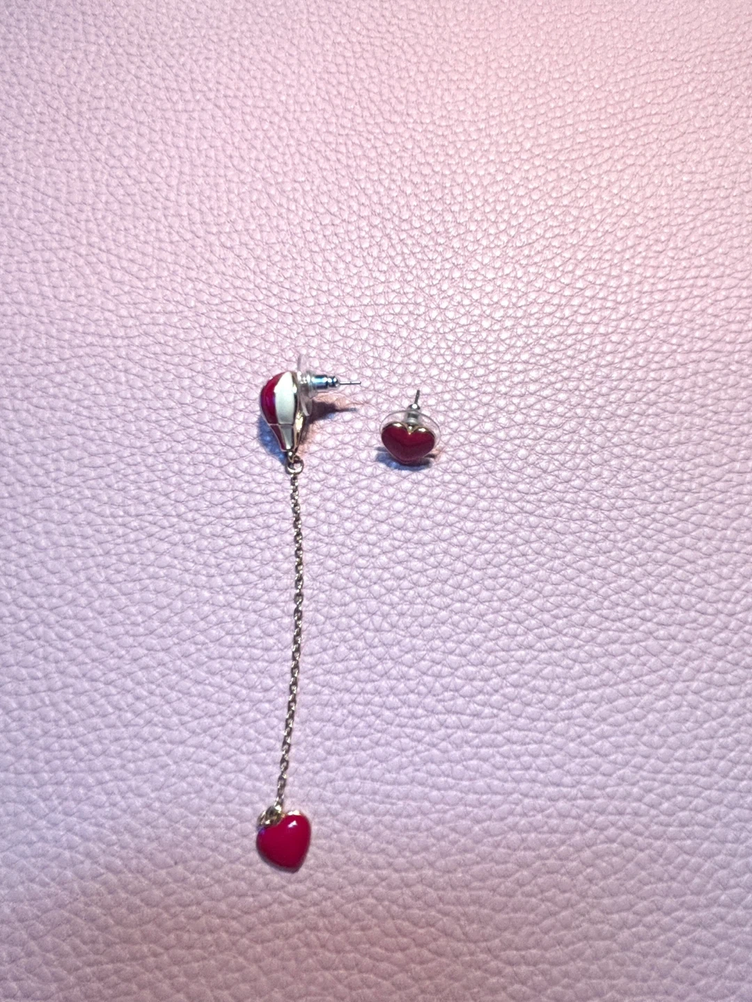A pair of cute dangle earrings featuring a hot air balloon charm with a chain and a red heart dangle. The other earring is a matching red heart stud. Perfect for adding a whimsical touch to your outfit!