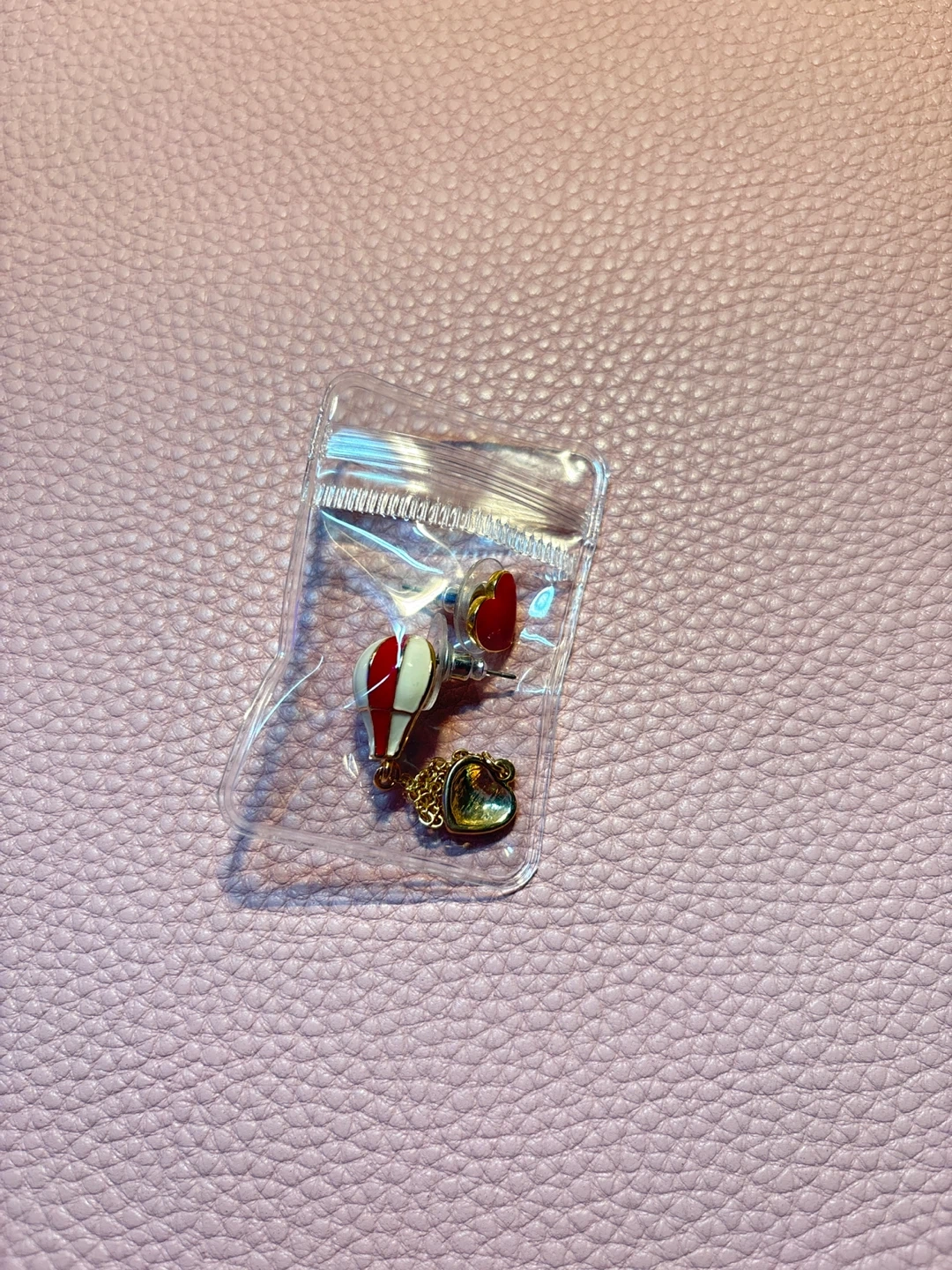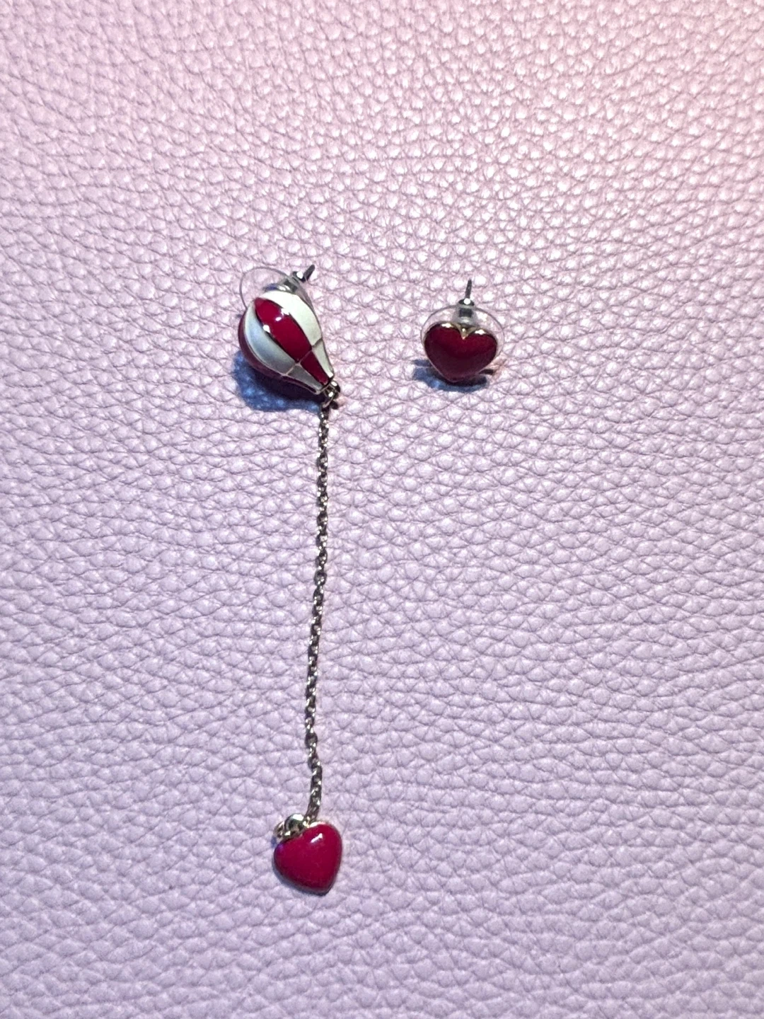 A pair of cute dangle earrings featuring a hot air balloon charm with a chain and a red heart dangle. The other earring is a matching red heart stud. Perfect for adding a whimsical touch to your outfit!