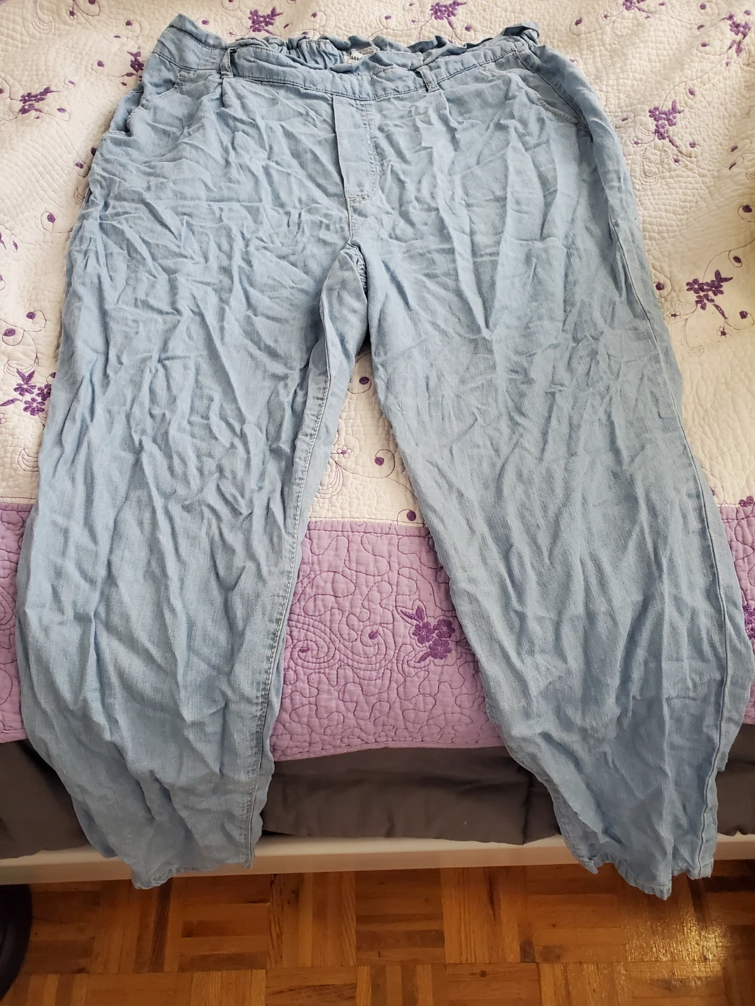 Light wash denim pants from GARAGE. These pants feature a paperbag waist and a relaxed fit. Size is 14/XL. Made in China. Waistband can stretch a bit.
