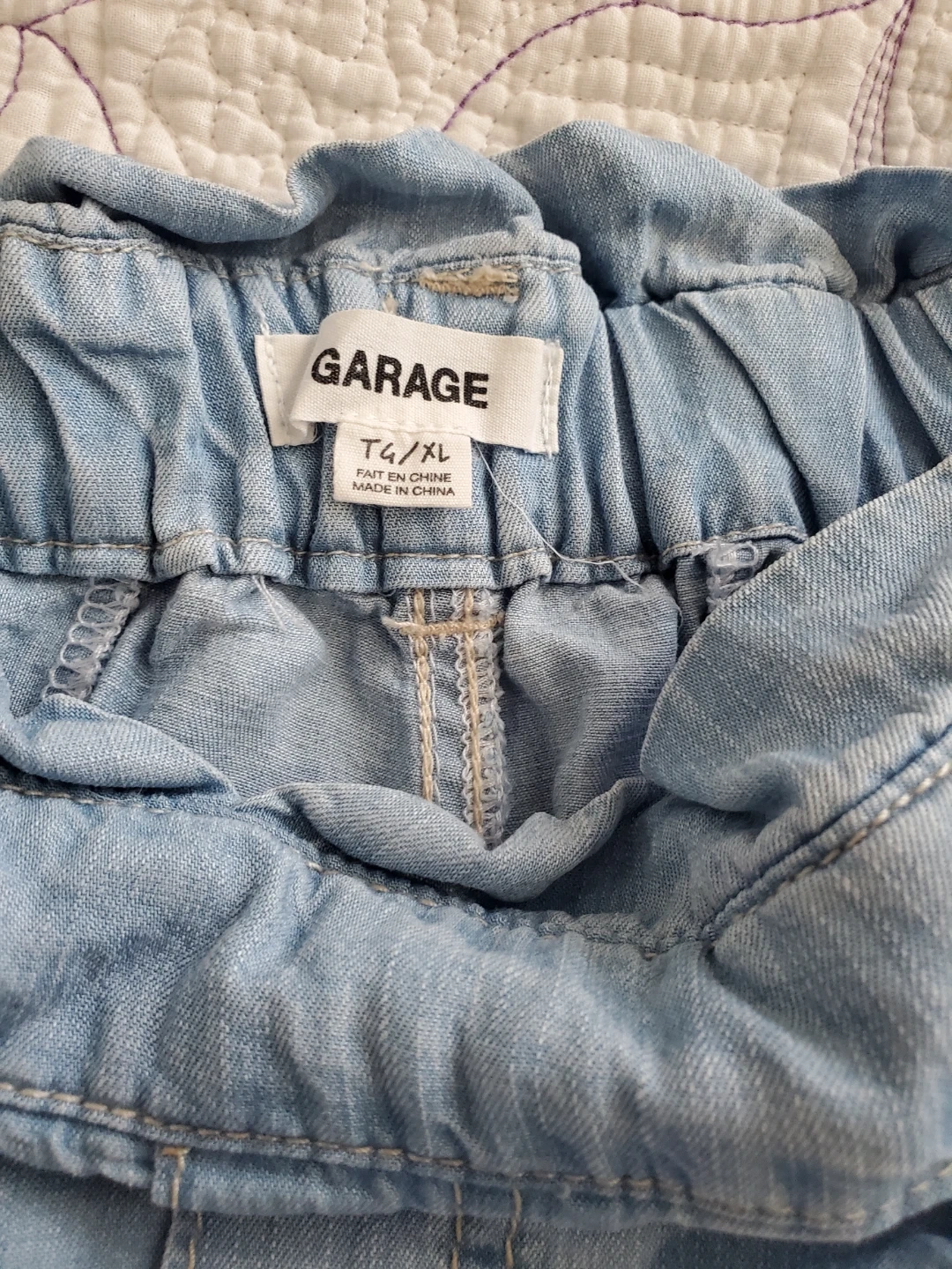 Light wash denim pants from GARAGE. These pants feature a paperbag waist and a relaxed fit. Size is 14/XL. Made in China. Waistband can stretch a bit.