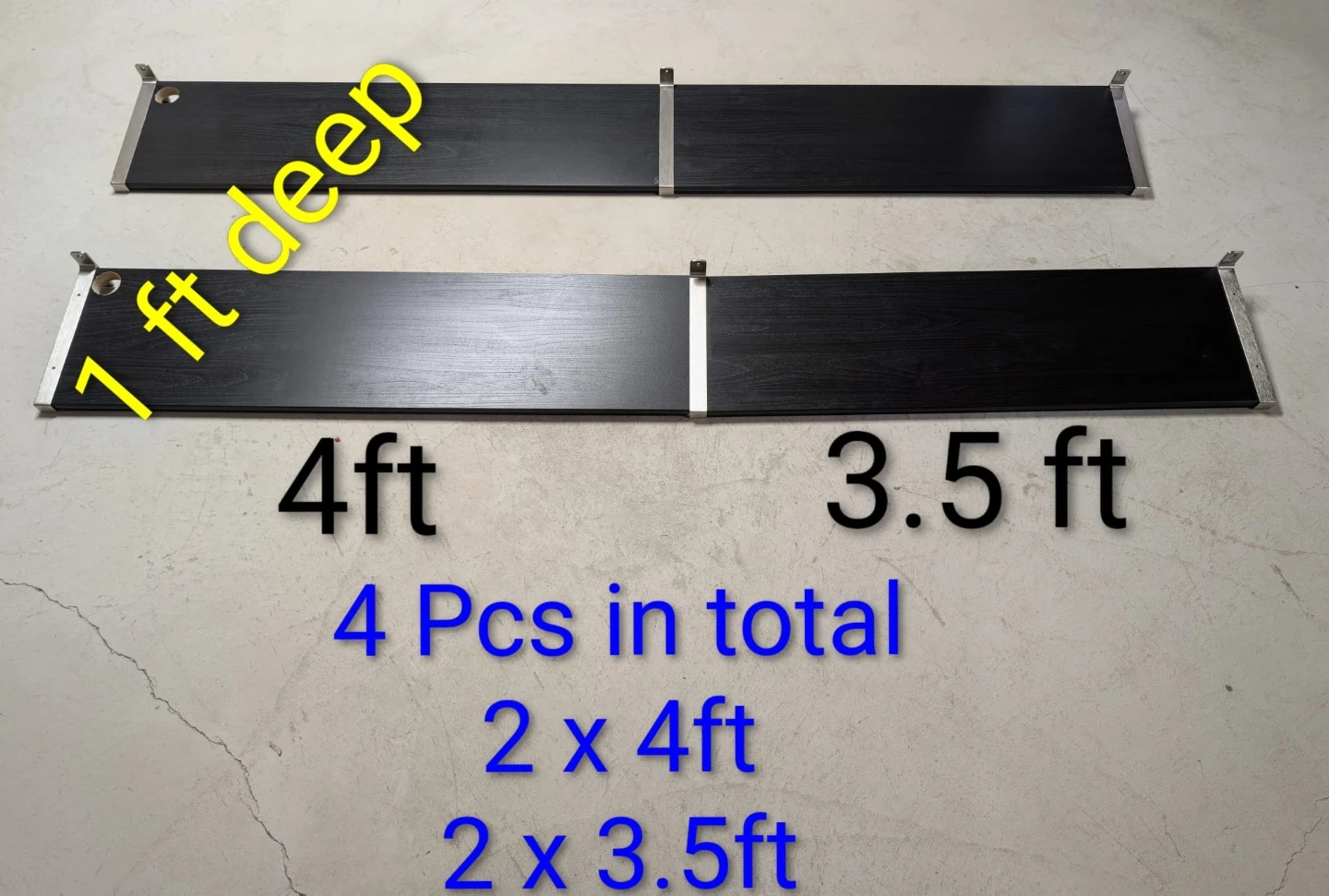 Four black wood shelves are included, with two measuring 4ft long and two measuring 3.5ft long. They are all 1ft deep with silver metal brackets. Perfect for officr space or organizing space.