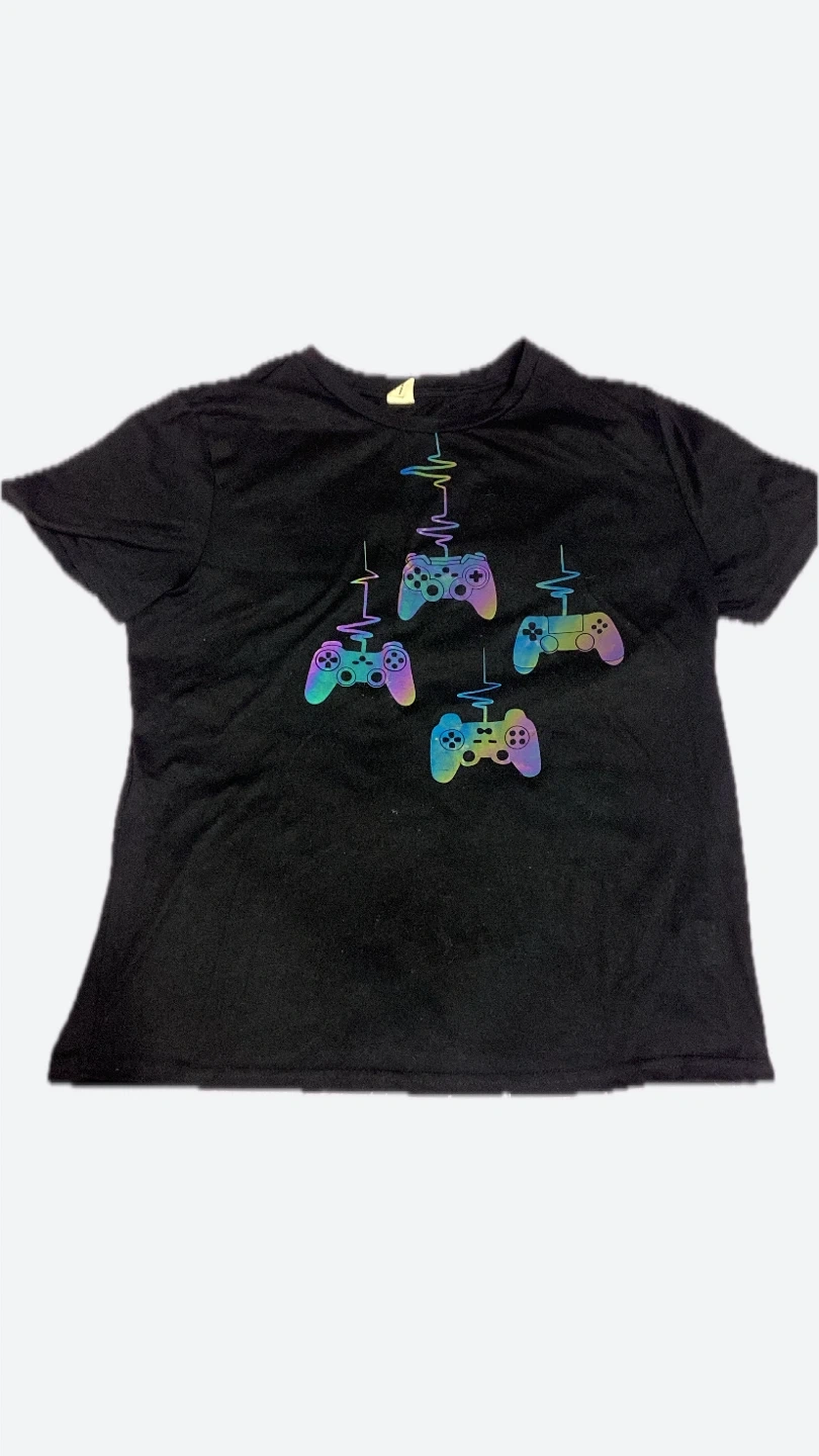 Black t-shirt featuring a vibrant graphic of rainbow-colored video game controllers. Made from soft fabric for comfort. It's a fun way to show your gamer pride! BOTH GENDERS!