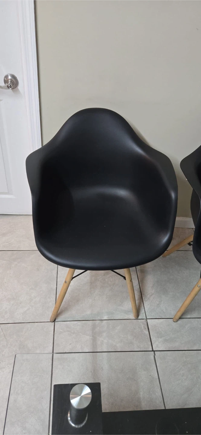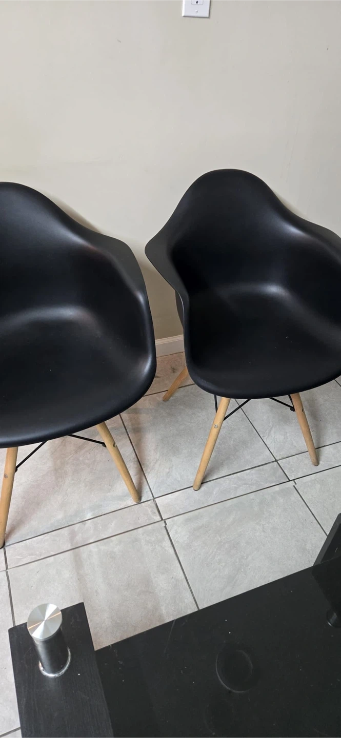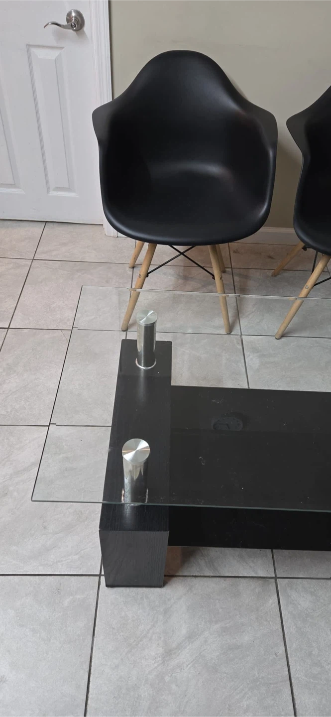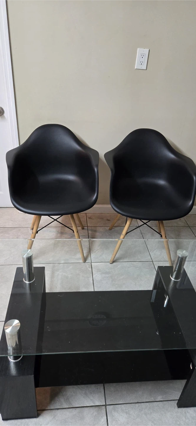 Selling a coffee table with a black frame and glass top, along with two matching black chairs. They're in good condition and would look great in any living room!