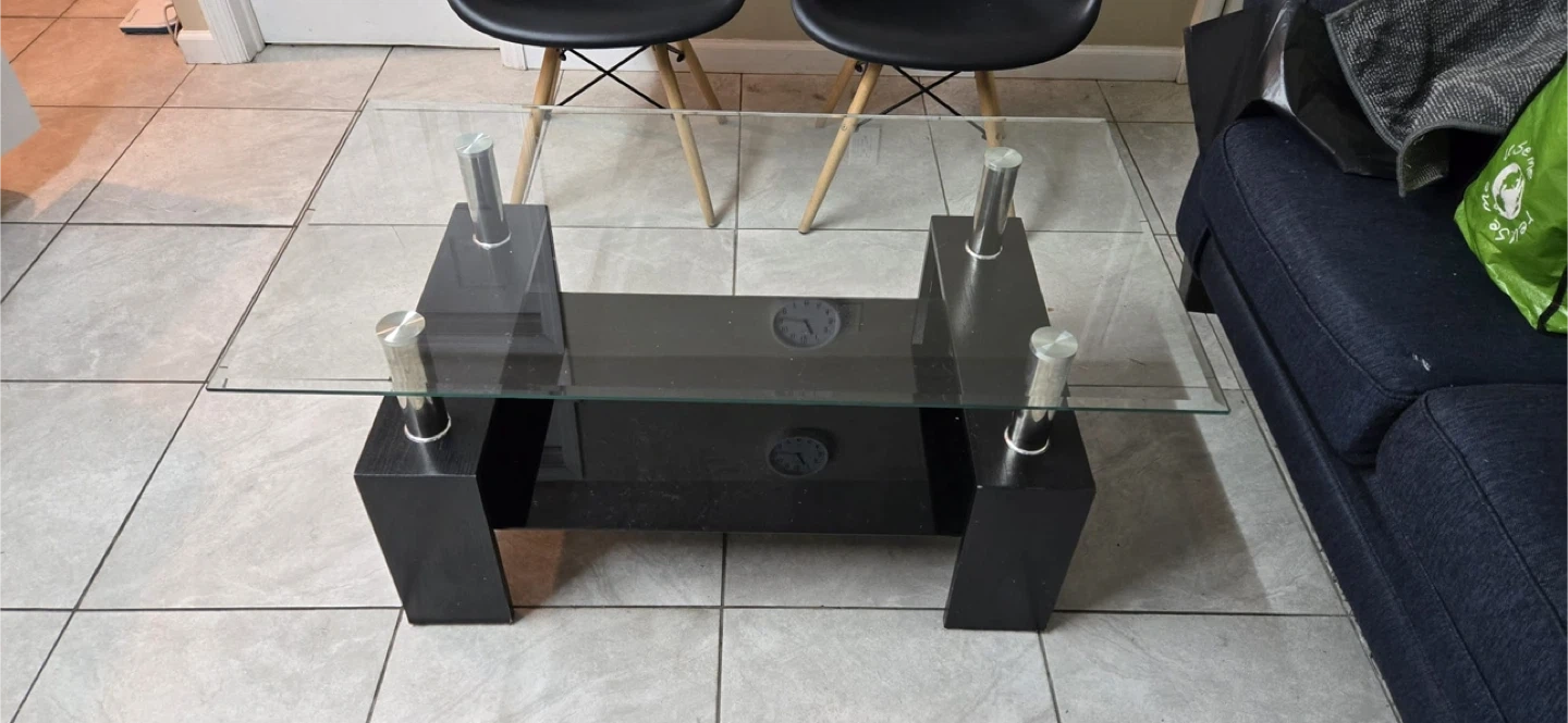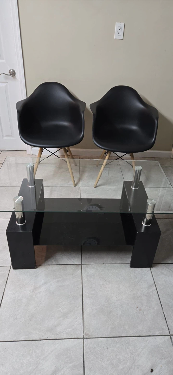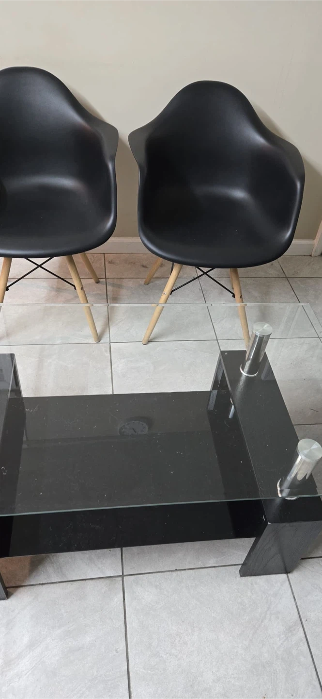 Selling a coffee table with a black frame and glass top, along with two matching black chairs. They're in good condition and would look great in any living room!