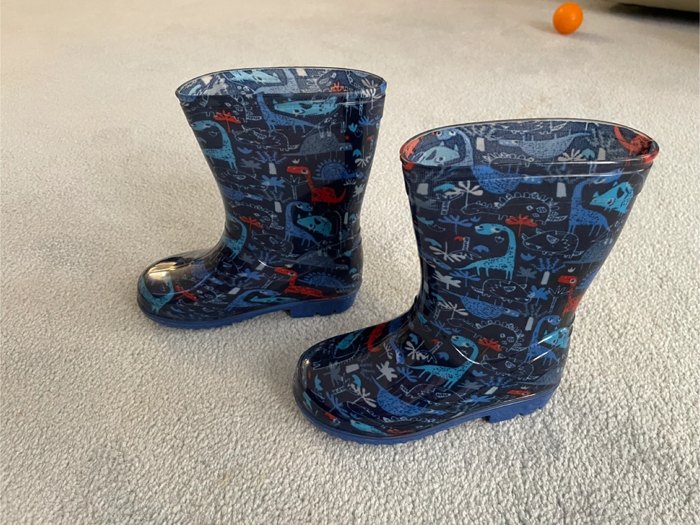 These cute navy blue rain boots have a fun dinosaur pattern. They're made of waterproof material to keep little feet dry. Perfect for puddle jumping!