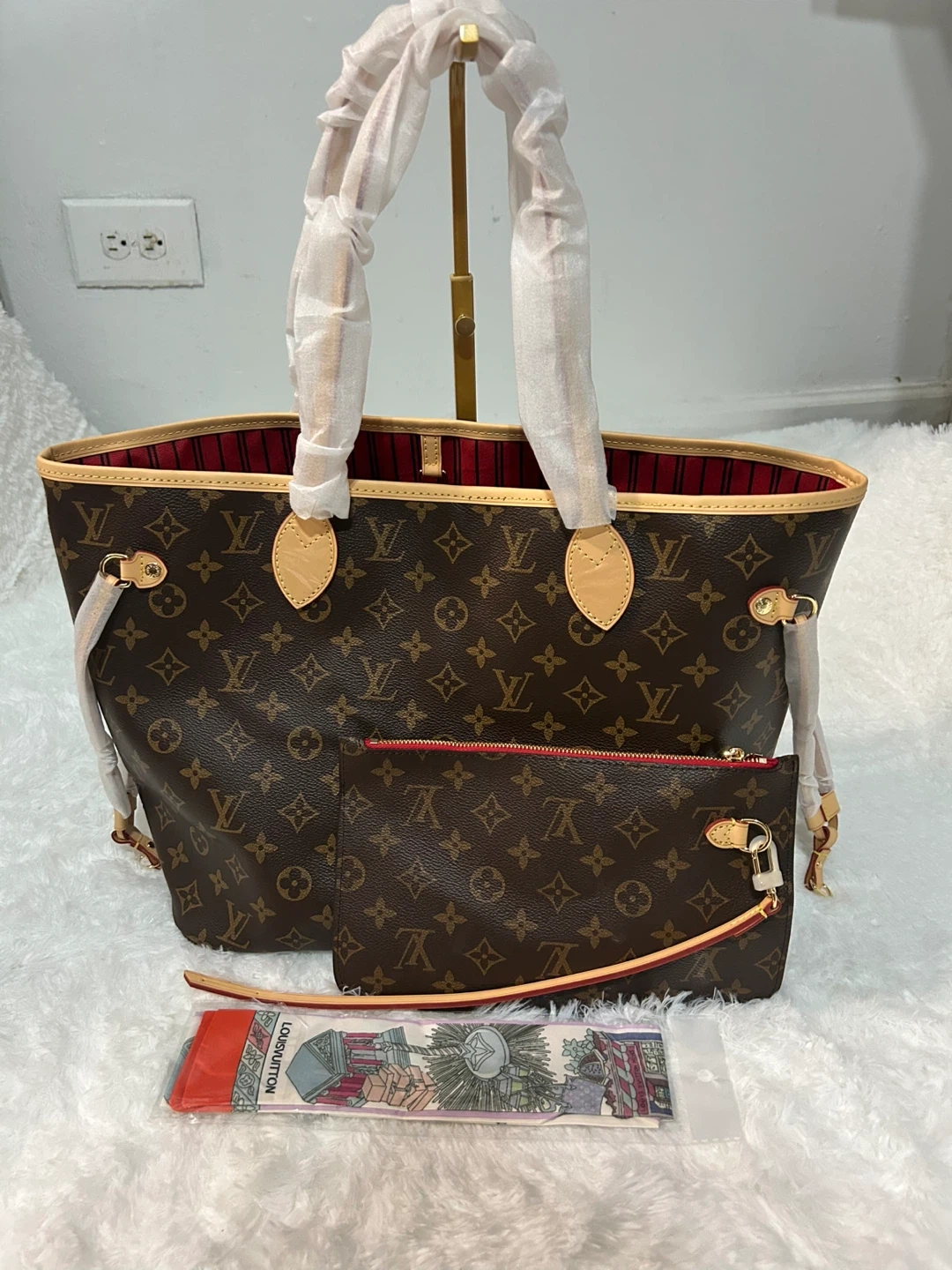Classic Louis Vuitton Neverfull GM tote bag. Crafted from signature monogram canvas. Features a spacious interior with a zip pocket and a red striped lining. Comes with a matching pochette and a silk scarf.