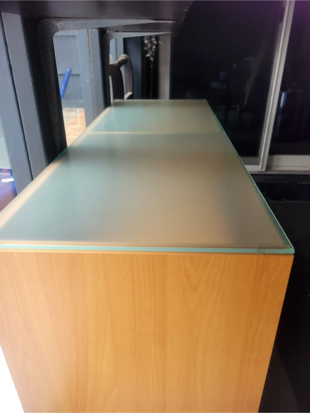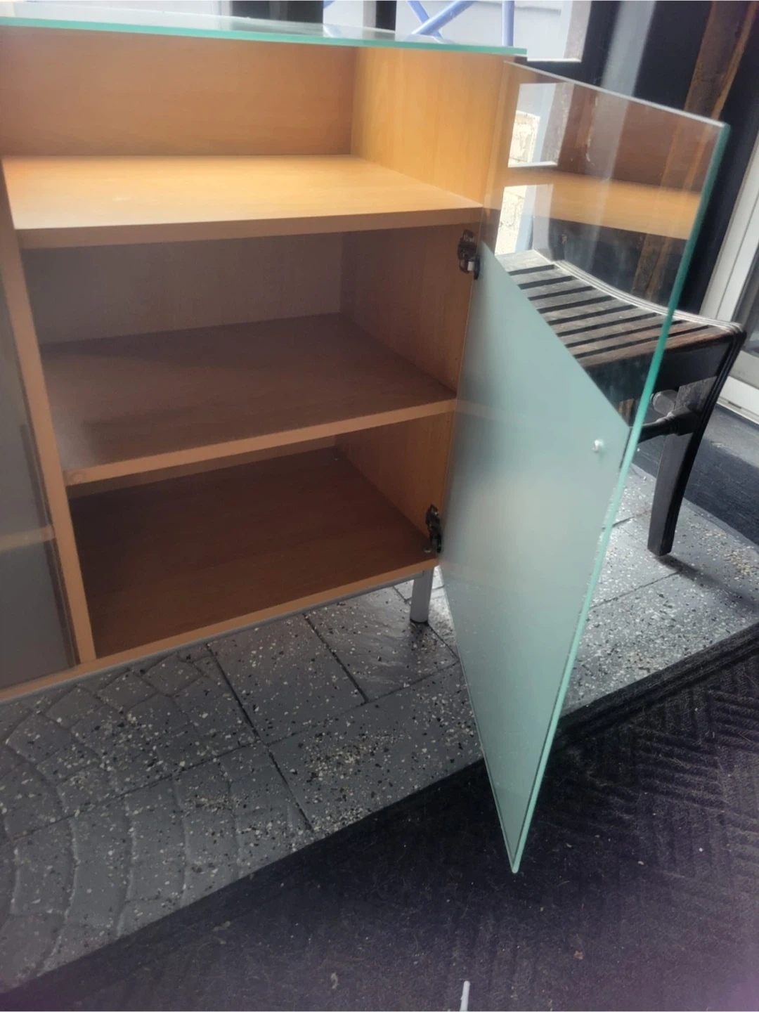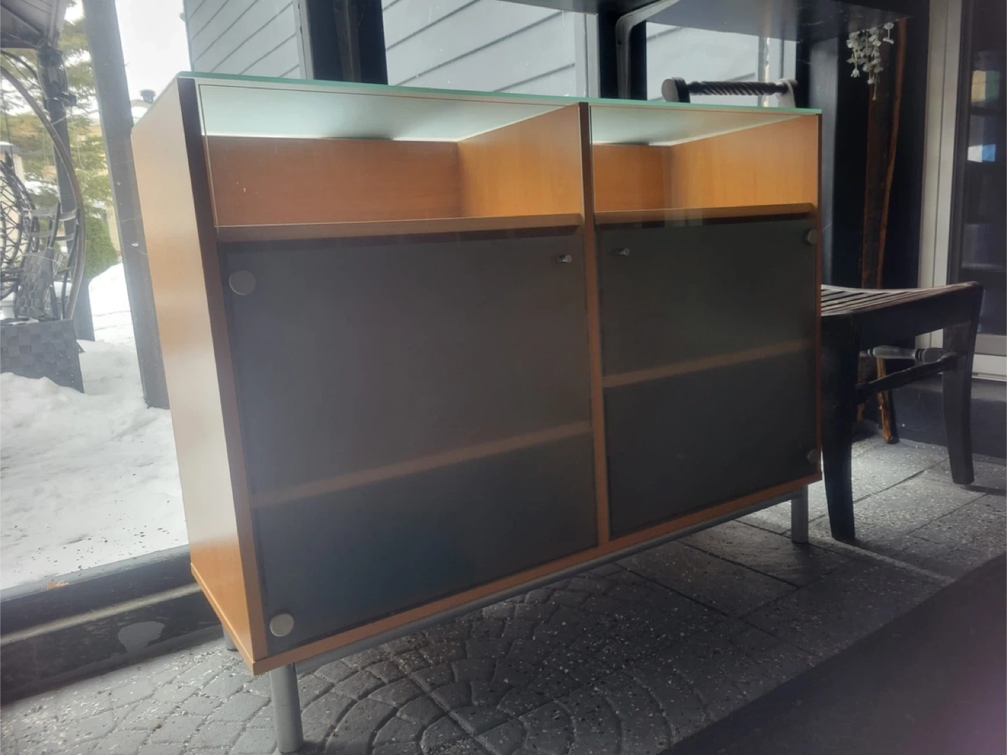 Selling a display cabinet featuring glass doors. It has a wood frame and metal legs. It's in good condition and would be great for displaying your favourite items or storing things neatly!
