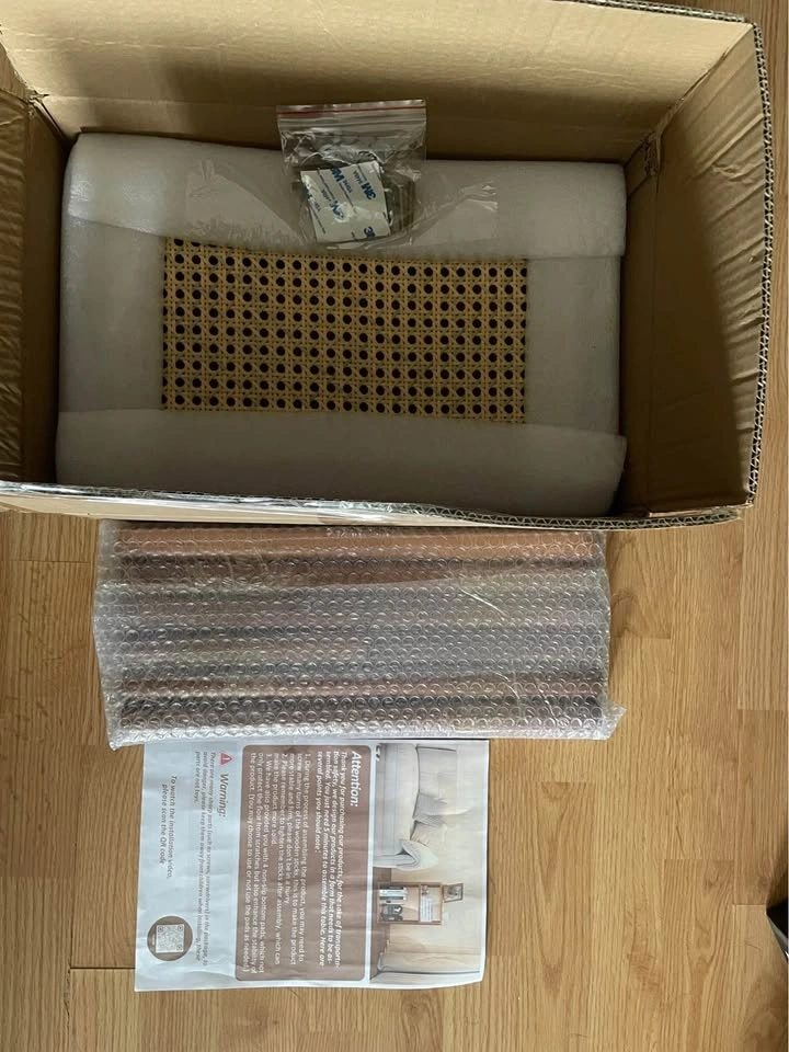 Stylish new in box 3-tier nightstand. Has a cool wood and rattan detail, still unassembled in original packaging. Perfect as a bedside table, small bookshelf, or just a cute accent piece.