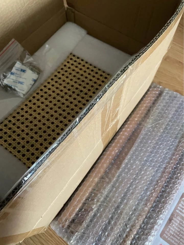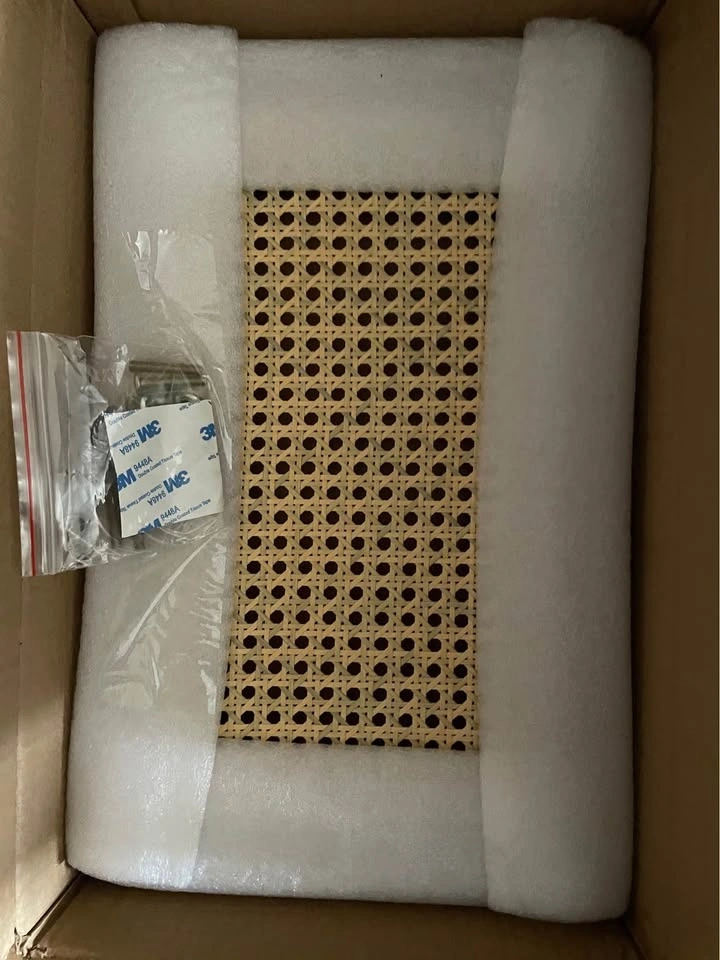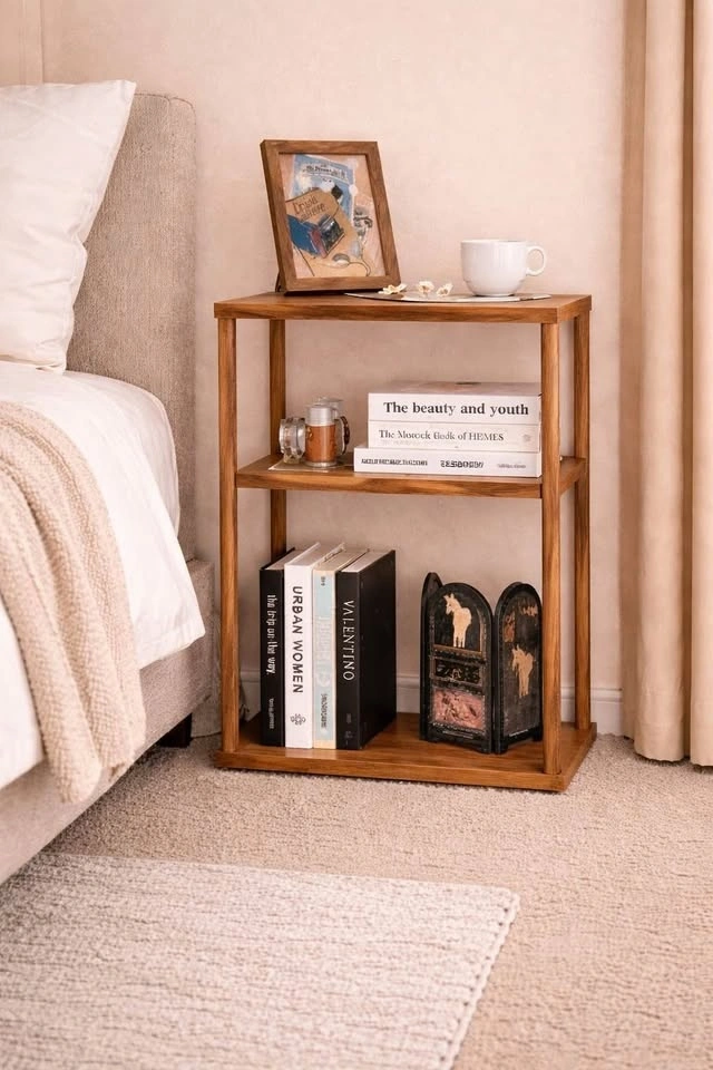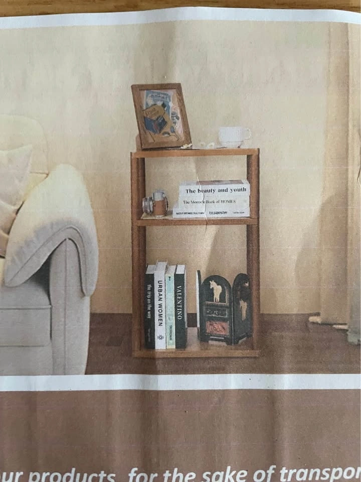 Stylish new in box 3-tier nightstand. Has a cool wood and rattan detail, still unassembled in original packaging. Perfect as a bedside table, small bookshelf, or just a cute accent piece.