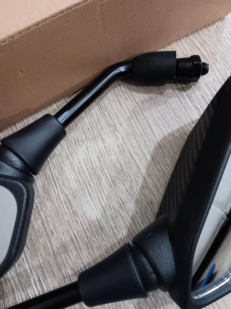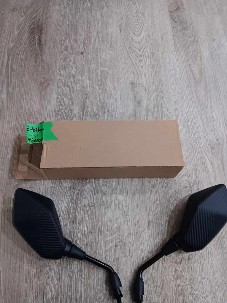 New set of mirrors for a motorcycle or e-bike, triangle shape. They have a 10 mm male connector, and that was the wrong size for my ebike. You could also buy a reducer adapter at a local store like bolts plus, for maybe two to four dollars, to adapt this to your bike.
