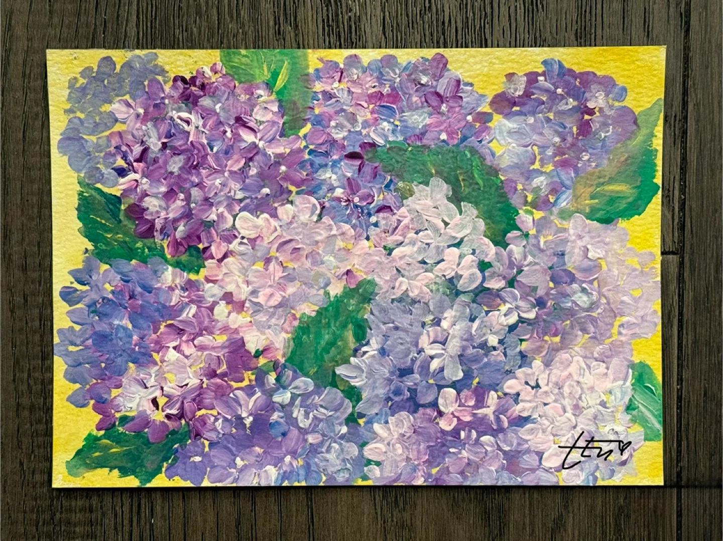 This is an original gouache hydrangeas. The artwork is unframed and on 5”X7” watercolour paper, finished with artist wax topcoat to durability and protection. It's a lovely piece to brighten any room! Artitist signature on back. Digital signature as displayed on bottom right is for artist’s posting purposes only.