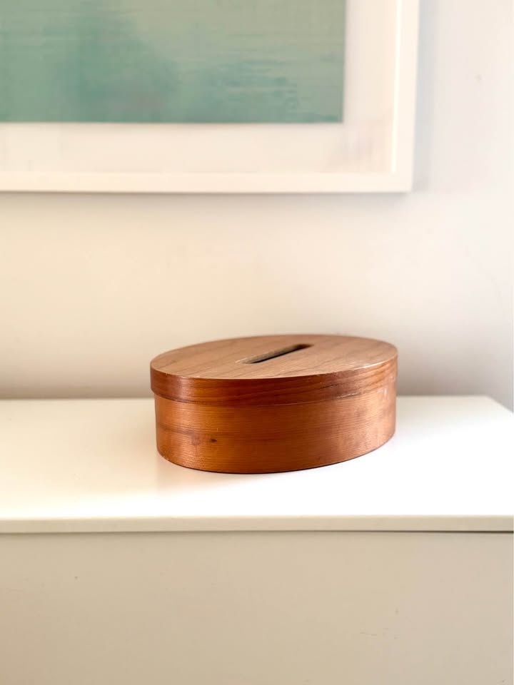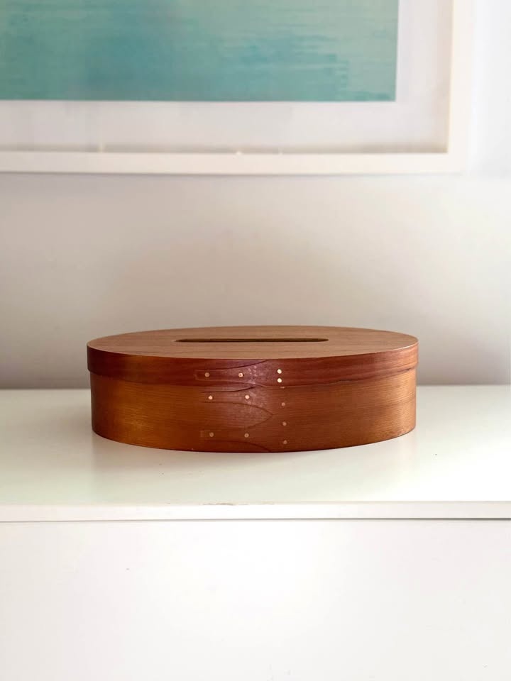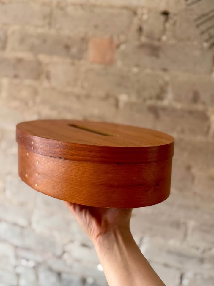 Beautifully handcrafted Shaker-style oval bentwood box. Features iconic "swallowtail" finger joints and copper tacks. Made from high-quality solid wood with a smooth, satin finish. The lid includes a functional slot, making it perfect as a unique coin bank, donation box, decorative keepsake, or tissue box