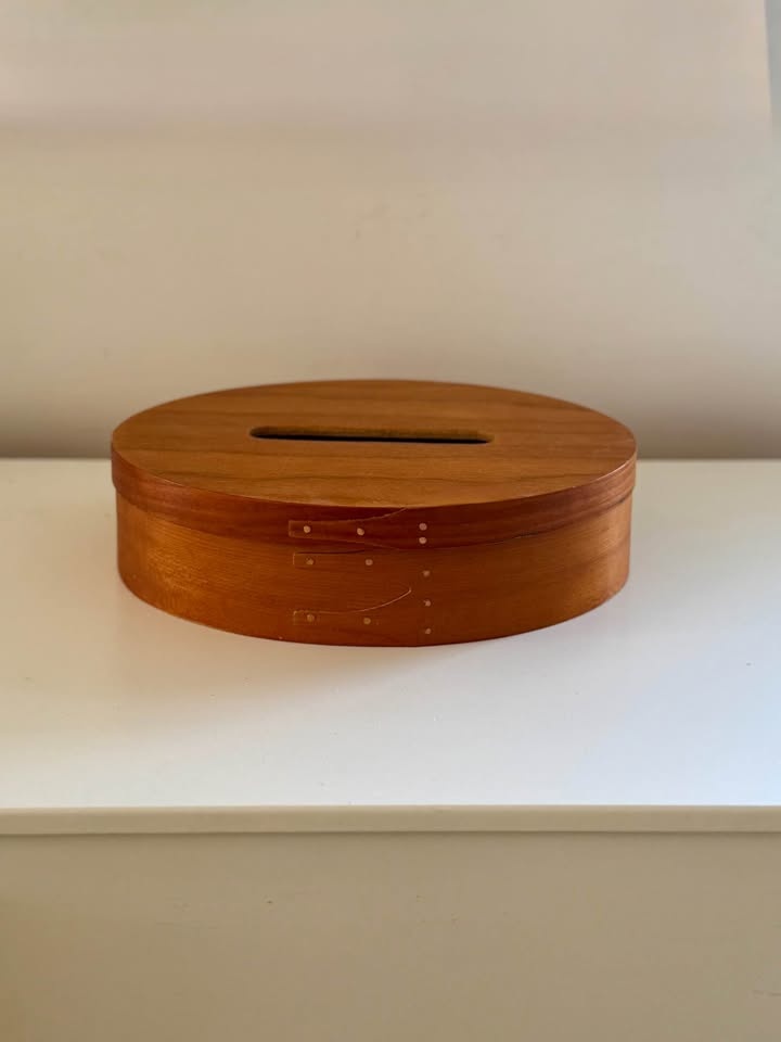 shaker box, oval wooden box, bentwood, swallowtail joints, handcrafted wood, primitive decor, farmhouse style, wood coin bank, donation box, cherry wood, maple wood, artisan made, antique style, heirloom quality, home decor, minimalist storage