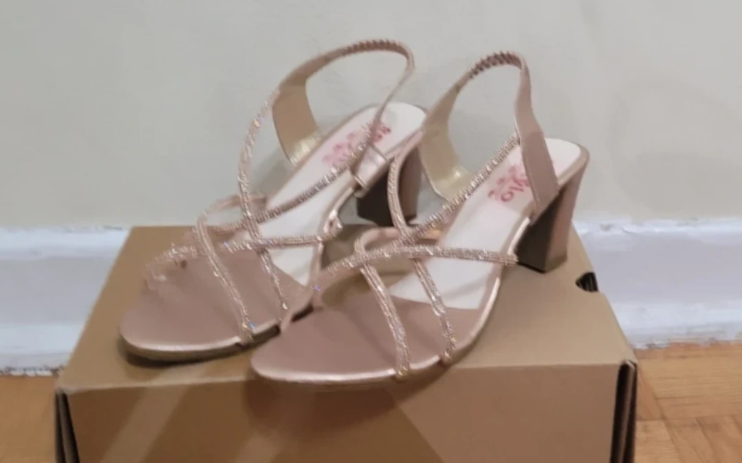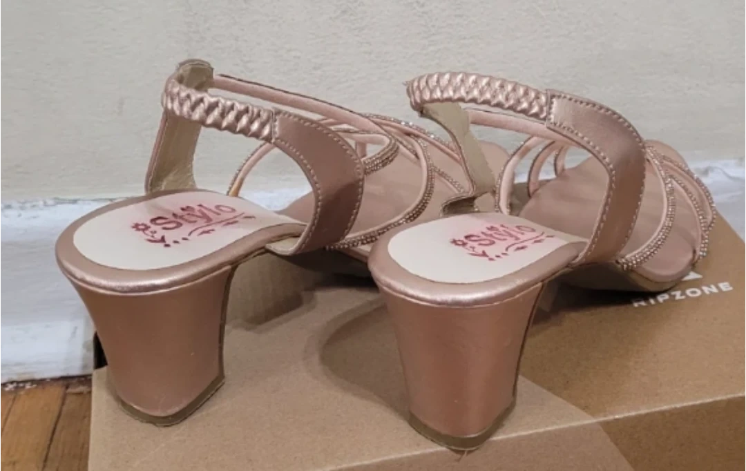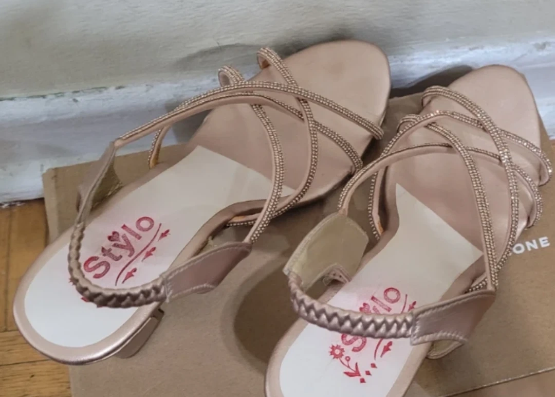 Stylish Stylo sandals in a rose gold hue, featuring delicate embellishments along the straps. These open-toe block heels offer a comfortable lift. Perfect for dressing up any outfit for a night out! Size 3.
