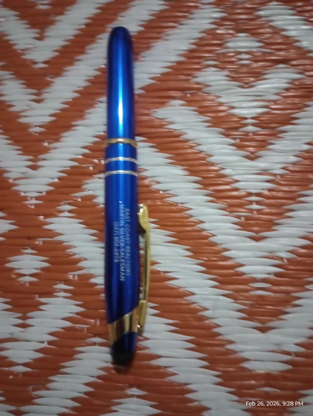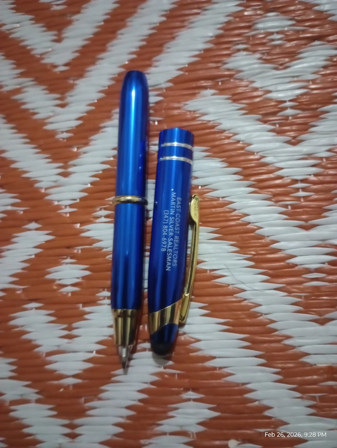 This is a blue promotional pen with gold accents. Text on the pen reads 'EAST COAST REALTORS' and '(347) 904-9779'. It's a click-action pen with a gold pocket clip.
