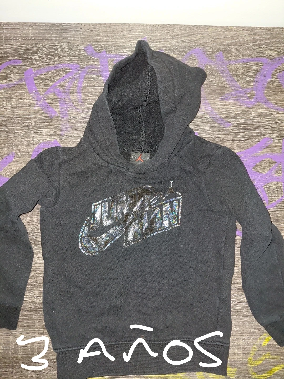 Selling a Jordan kids' hoodie in black. The size is for 3-year-olds. It has a cool, shiny Jordan logo on the front. Perfect for your little one!