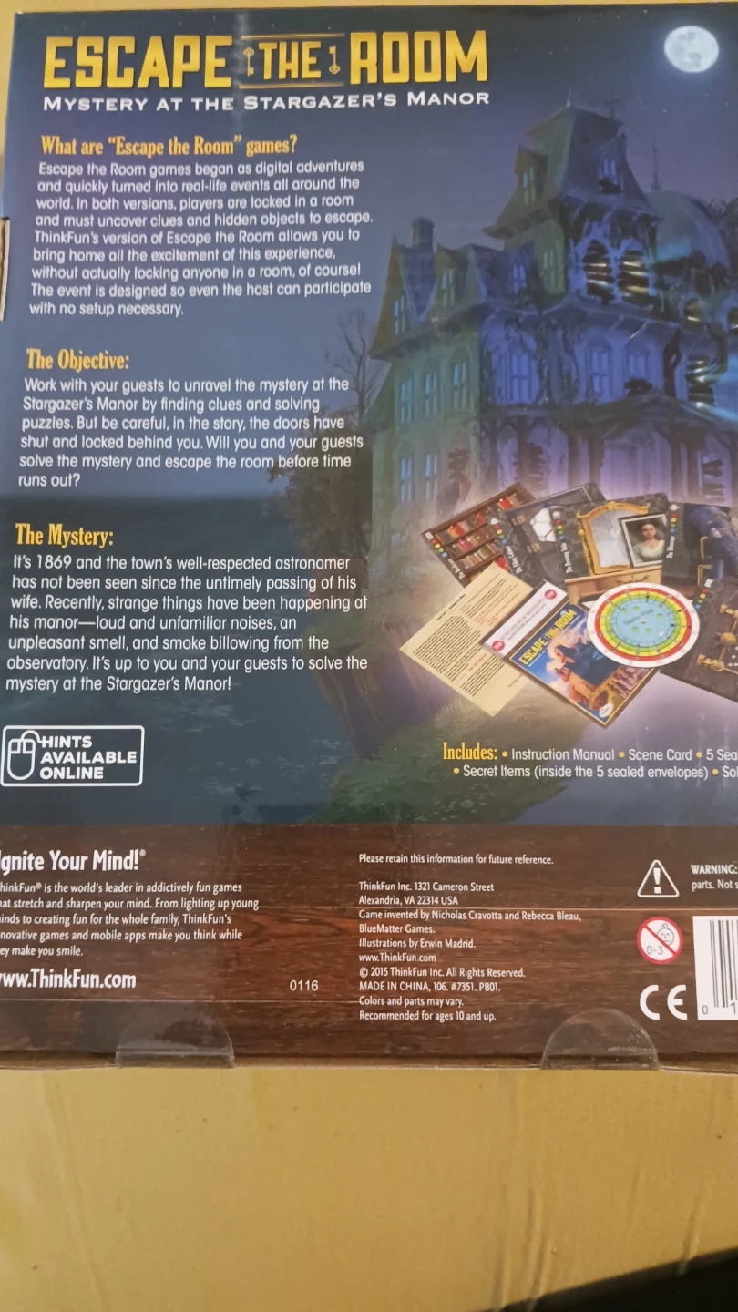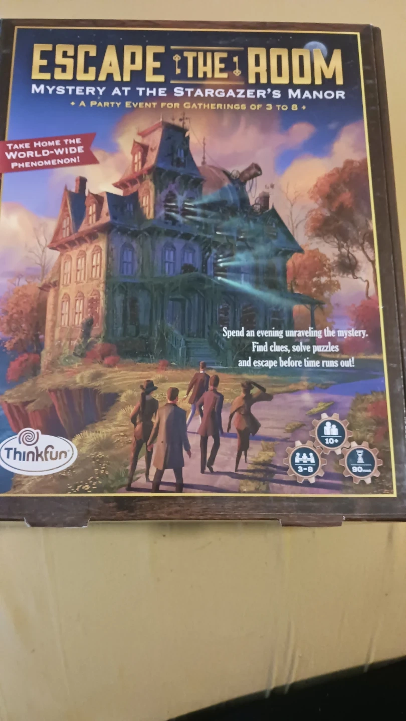 This ThinkFun Escape the Room board game is Mystery at the Stargazer's Manor. It's designed for gatherings of 3 to 8 players, recommended for ages 10 and up. Unravel the mystery by finding clues and solving puzzles! Brand spank'in new! Still sealed!