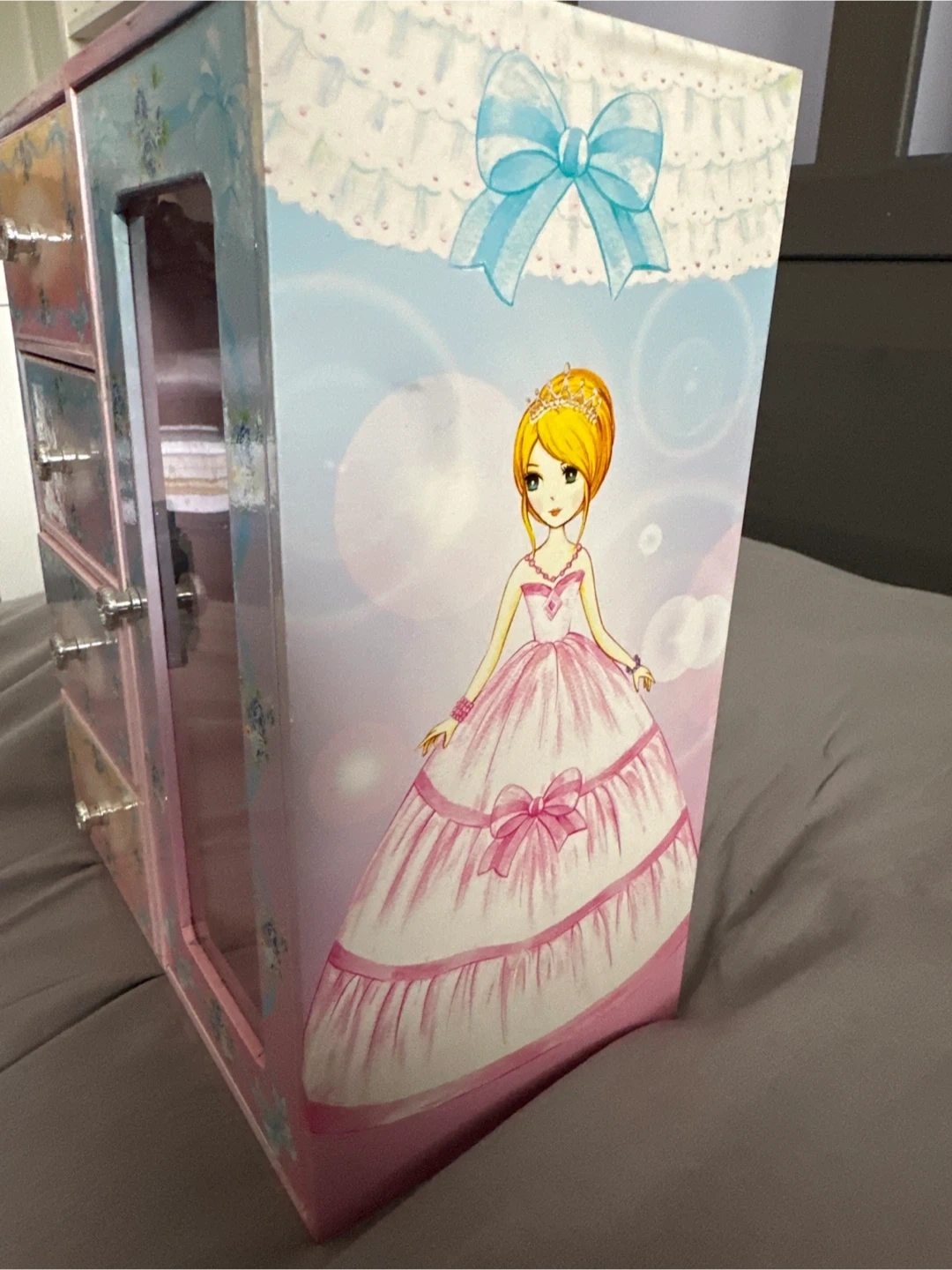 This charming jewelry box features multiple drawers for storage and a wardrobe-style compartment with a mirror. It's decorated with a princess and floral design, perfect for keeping trinkets organized. The drawers have decorative pulls, and the overall design is whimsical and colourful. It's ideal for storing small accessories and treasures!
