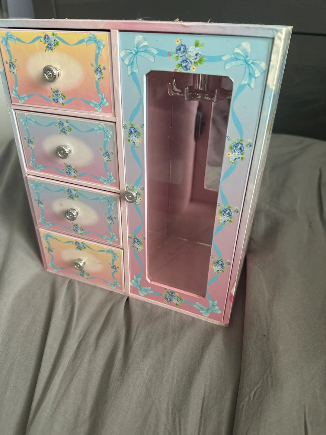 This charming jewelry box features multiple drawers for storage and a wardrobe-style compartment with a mirror. It's decorated with a princess and floral design, perfect for keeping trinkets organized. The drawers have decorative pulls, and the overall design is whimsical and colourful. It's ideal for storing small accessories and treasures!