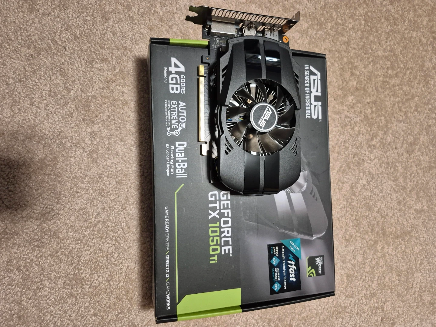 This is an ASUS GeForce GTX 1050 Ti graphics card with 4GB of GDDR5 memory. It features a Dual-Ball Bearing fan for durability. Includes the original box, speed setup guide, and driver CD. It still runs like new but doesn't fit in my new computer.