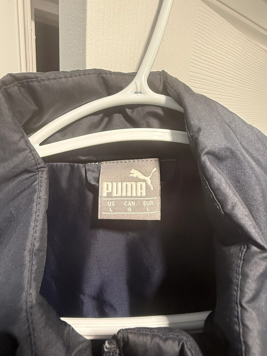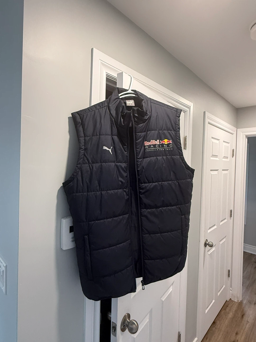 Dark navy puffer vest from Puma, featuring Red Bull Racing branding. Size L. It's a sleeveless design with a full zip closure. Great for a fan!