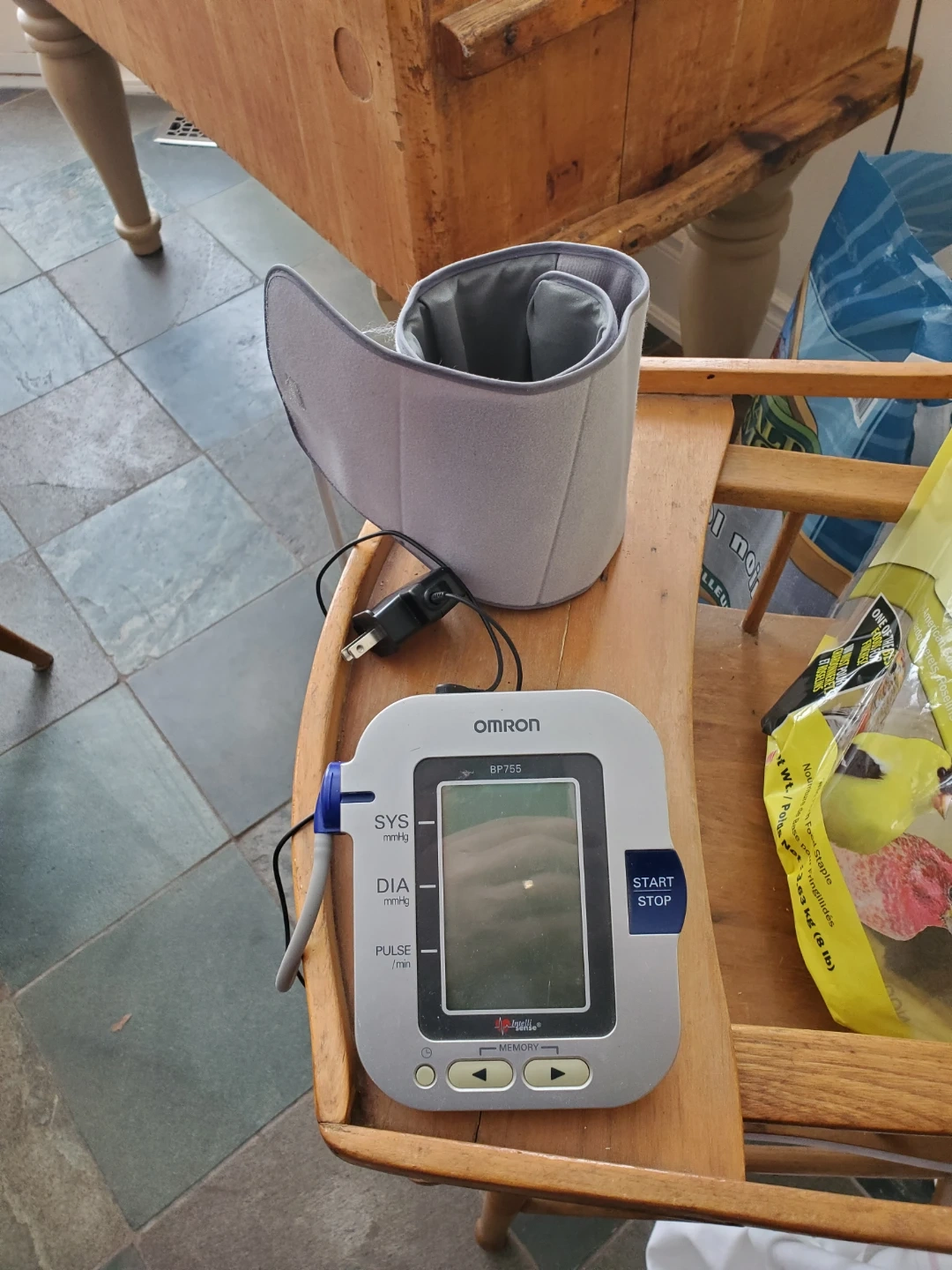 Omron BP755 automatic blood pressure monitor. It displays SYS, DIA, and PULSE readings. Includes cuff and AC adapter. Great for regular health monitoring at home!