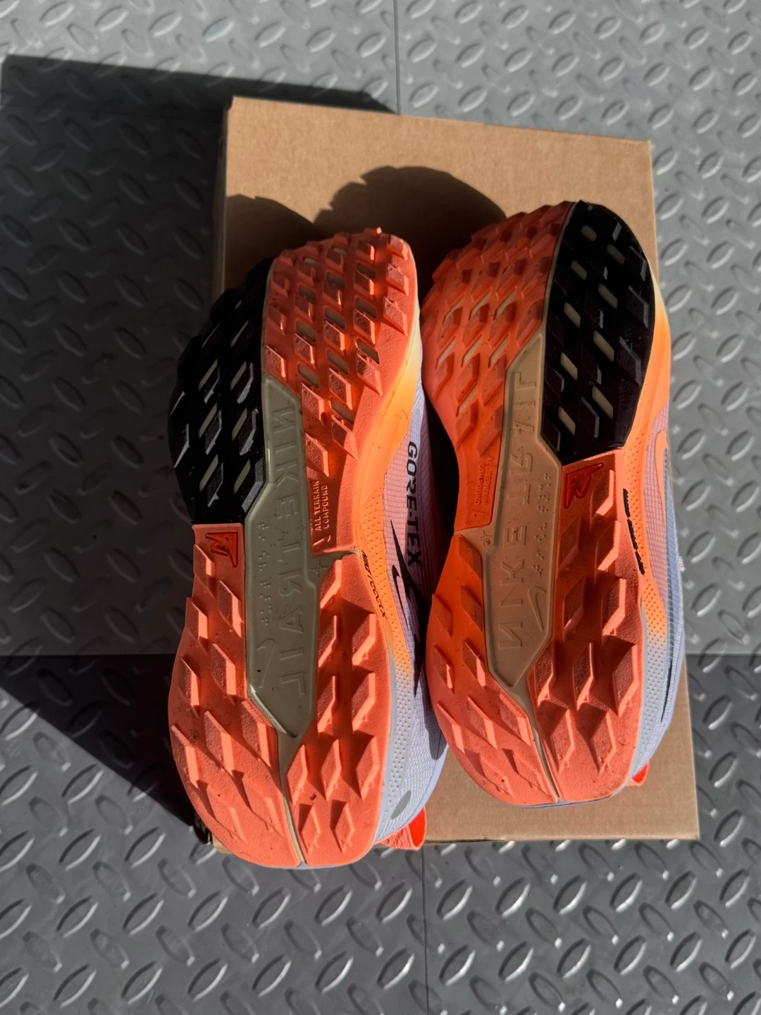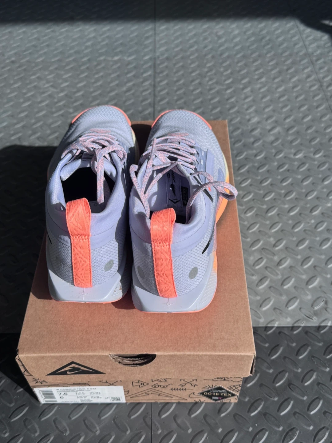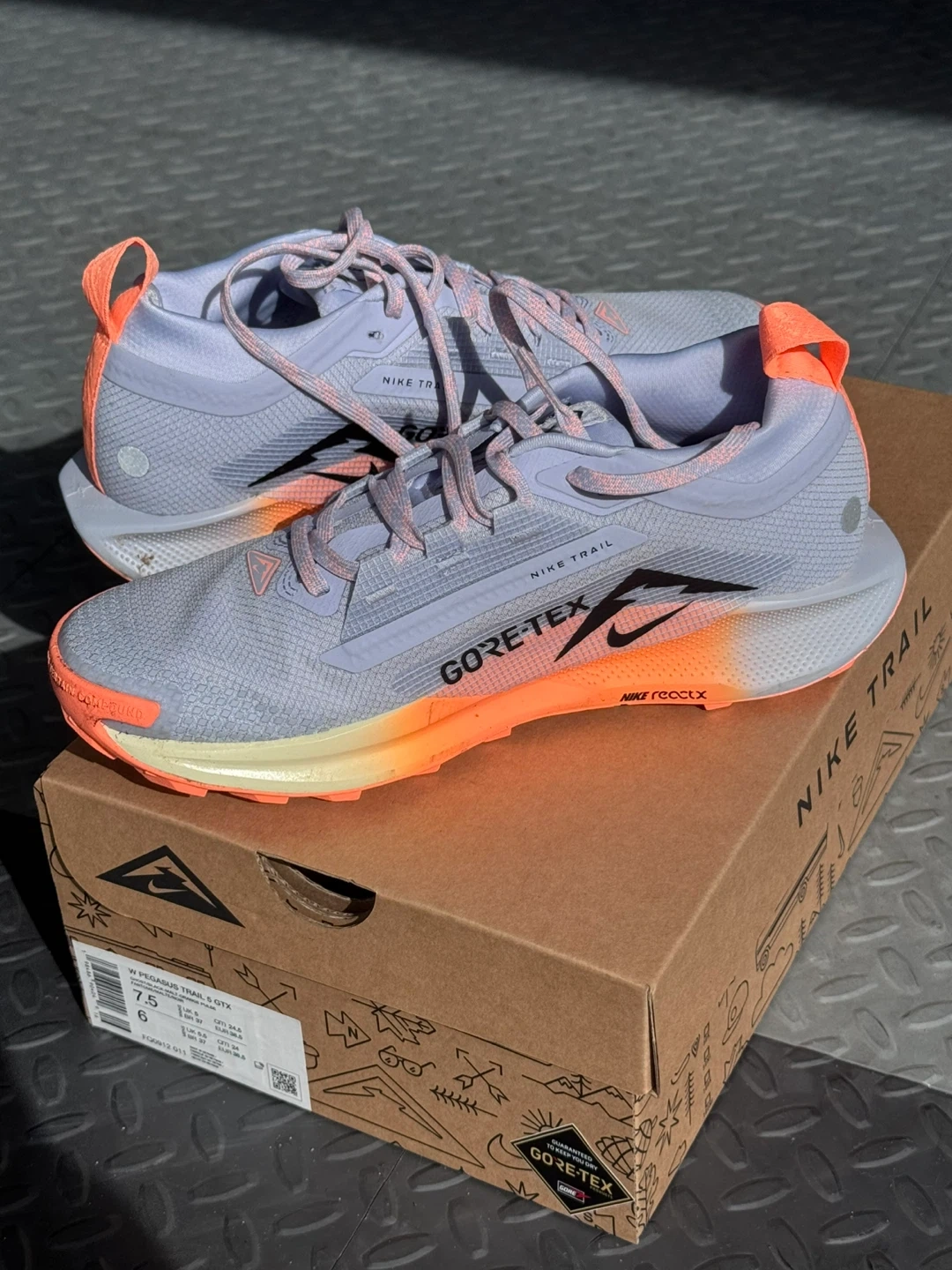 Nike Pegasus Trail GORE-TEX running shoes in a light grey and orange colourway. Size 7.5 US Women's. Includes original box.