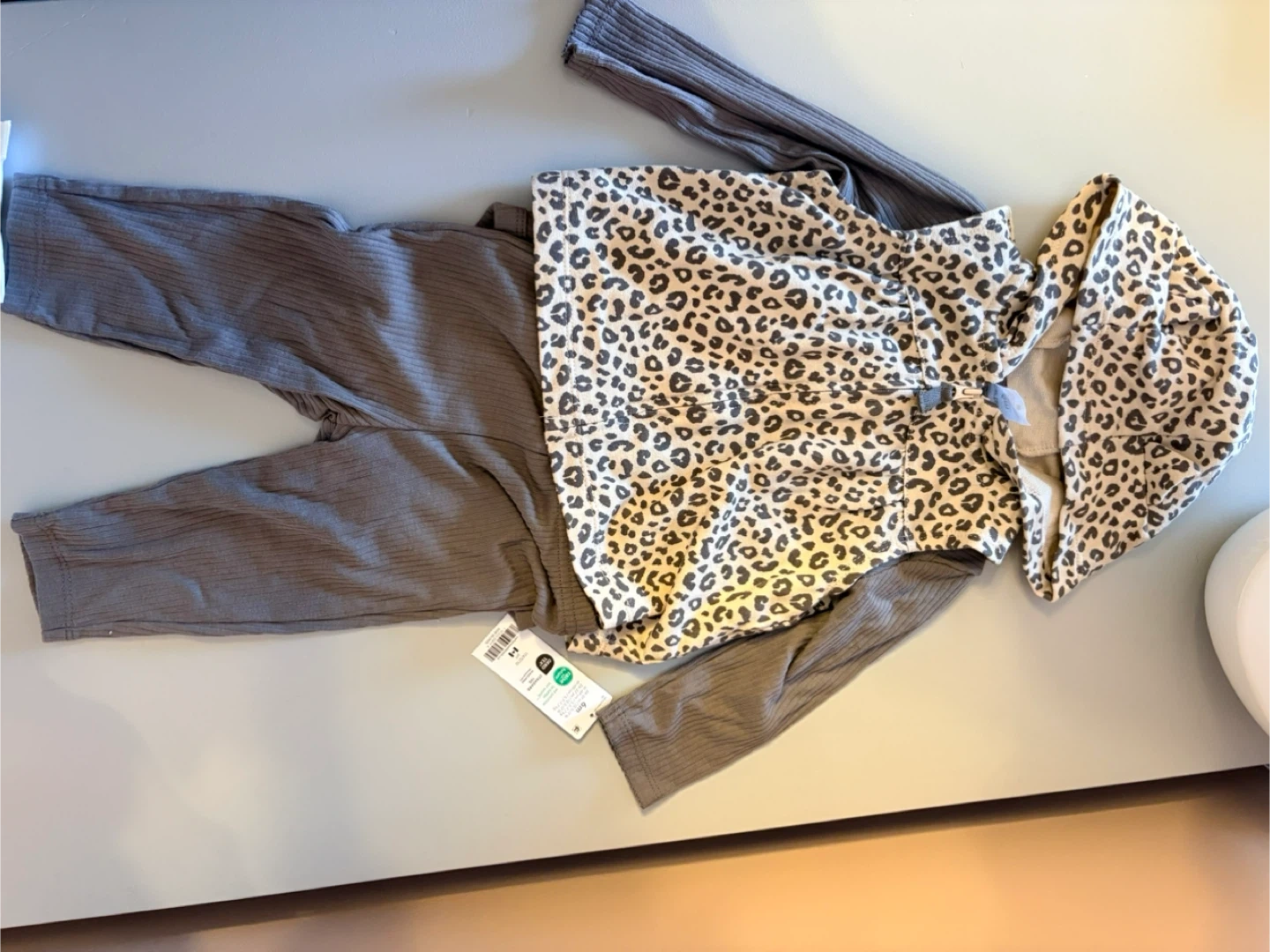 This adorable set features a long grey ribbed pants, a grey long sleeve onesie and hooded leopard print vest.
