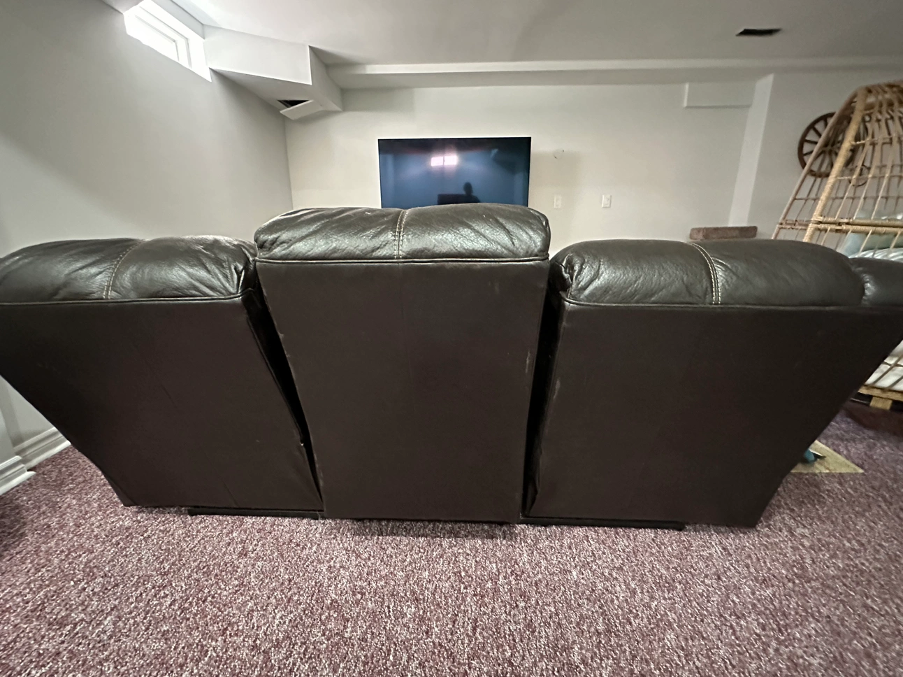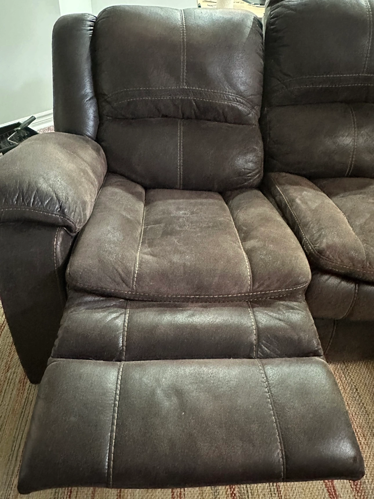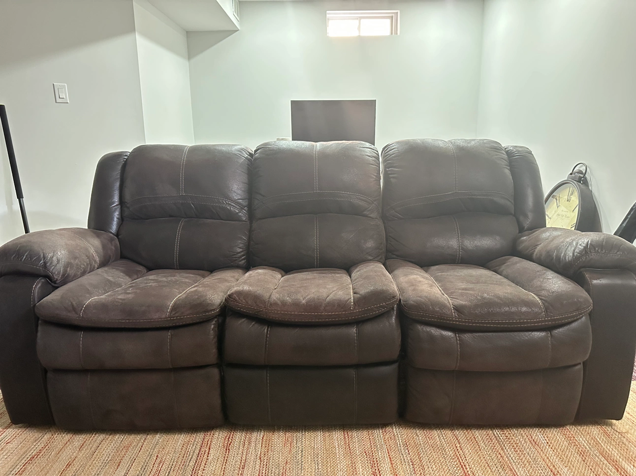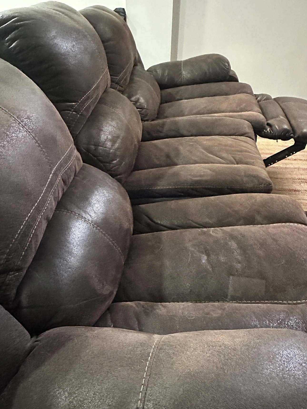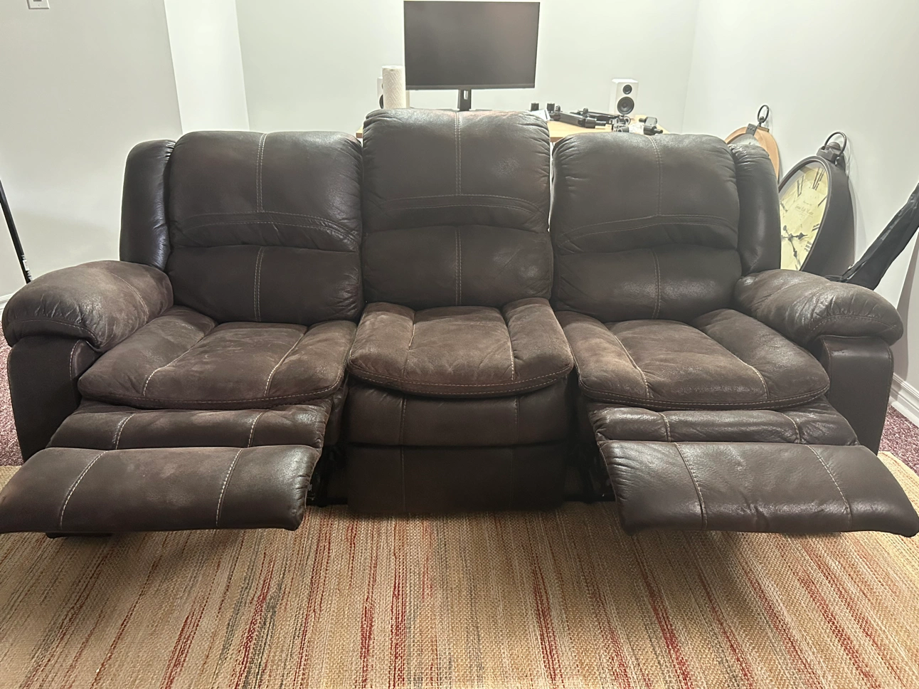 This is a 3 seater leather recliner sofa. Reclines using a pull at both the ends. Has fade marks because of usage. Pick up only. No shipping.
