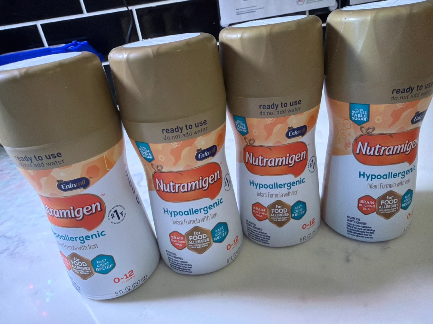 Four 8 oz bottles of Enfamil Nutramigen Hypoallergenic Infant Formula. Ready to use, no added water needed. Designed for babies 0-12 months, it's formulated with iron for food allergies and fast colic relief. Includes DHA for brain development.