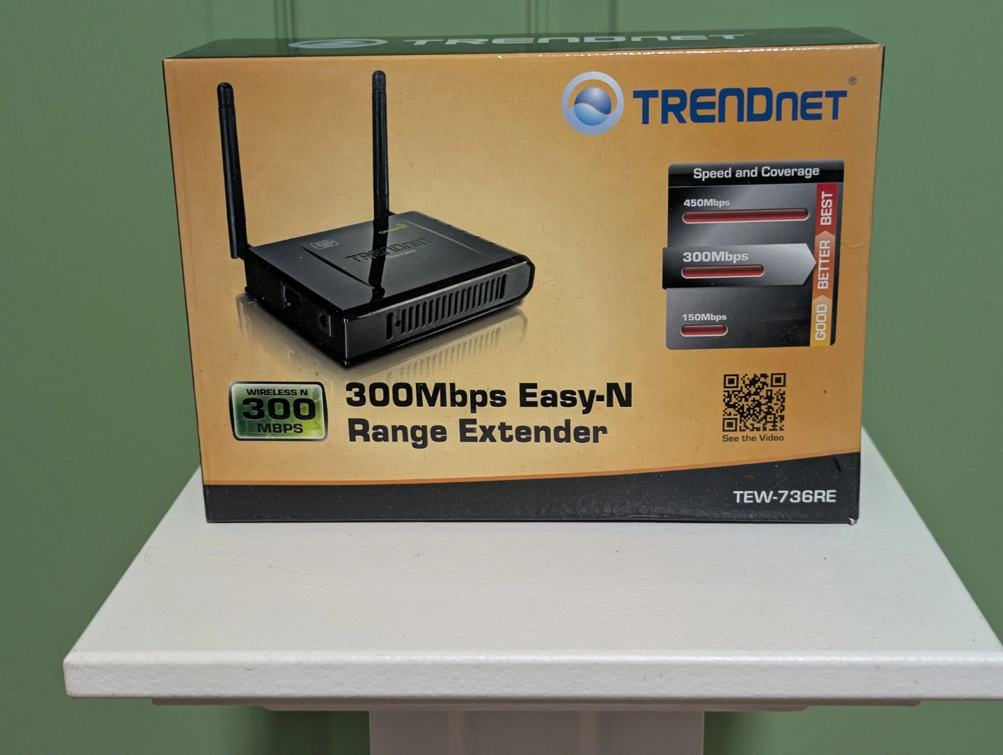 Like new TRENDnet wireless-N range extender. Includes power adapter and Ethernet cable. Model TEW-736RE. 300 Mbps speed.