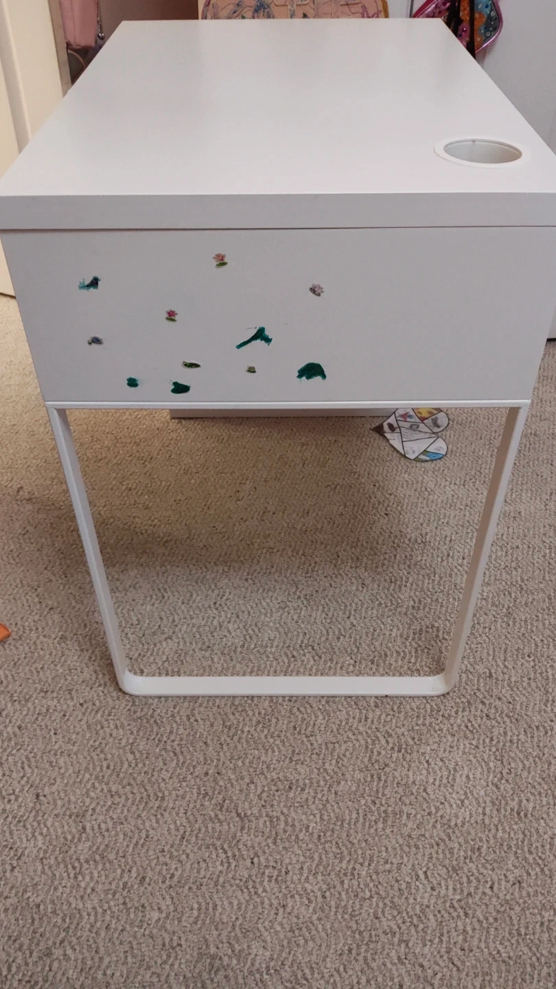 IKEA Micke desk featuring a pull-out drawer and a built-in cable holder. It's a compact and functional workspace solution. Suitable for small rooms or as a student's desk. Some stickers on one side.