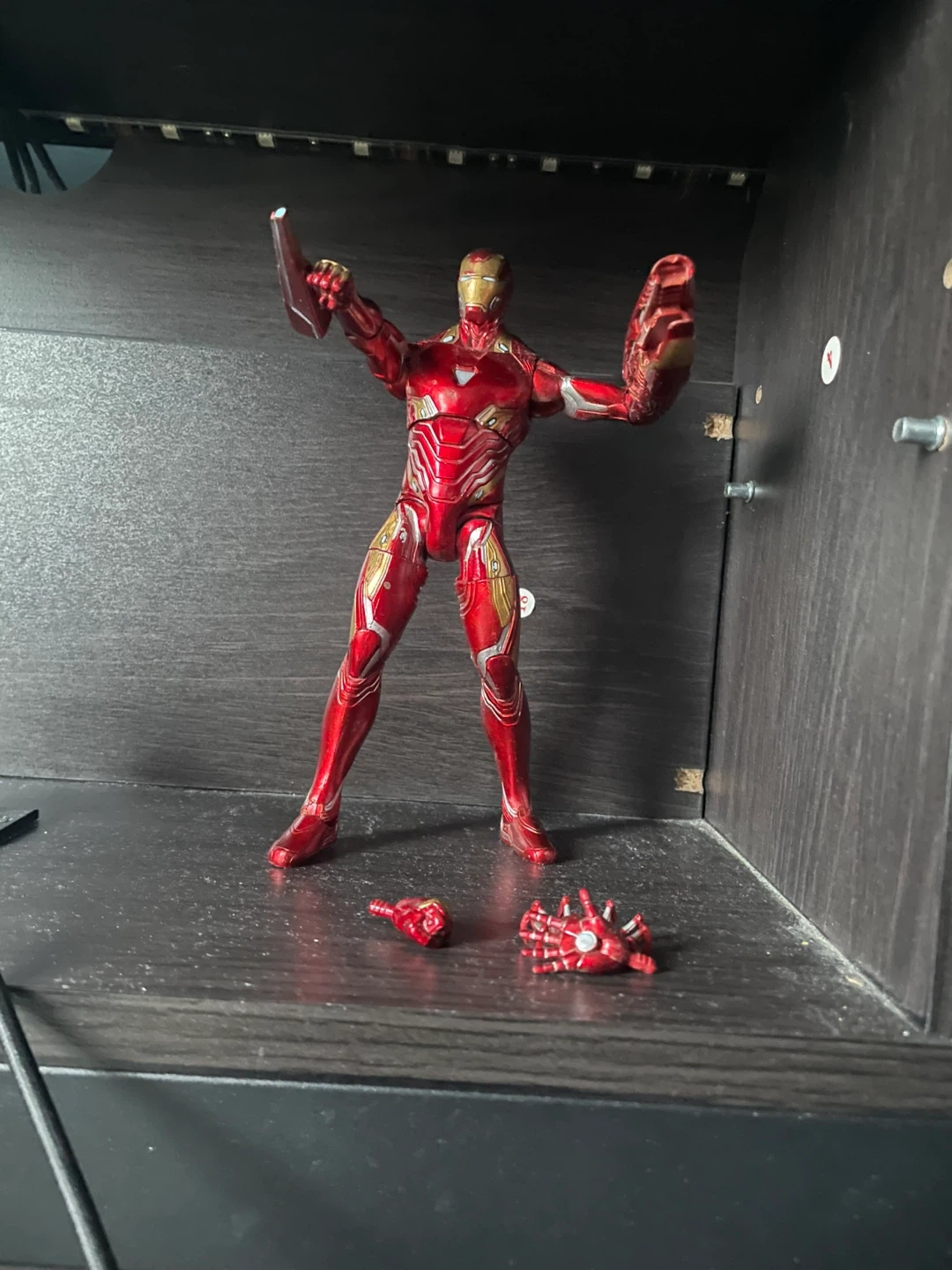 This is an Iron Man action figure with its signature red and gold suit. Includes extra hands and accessories. Great for Marvel fans!
