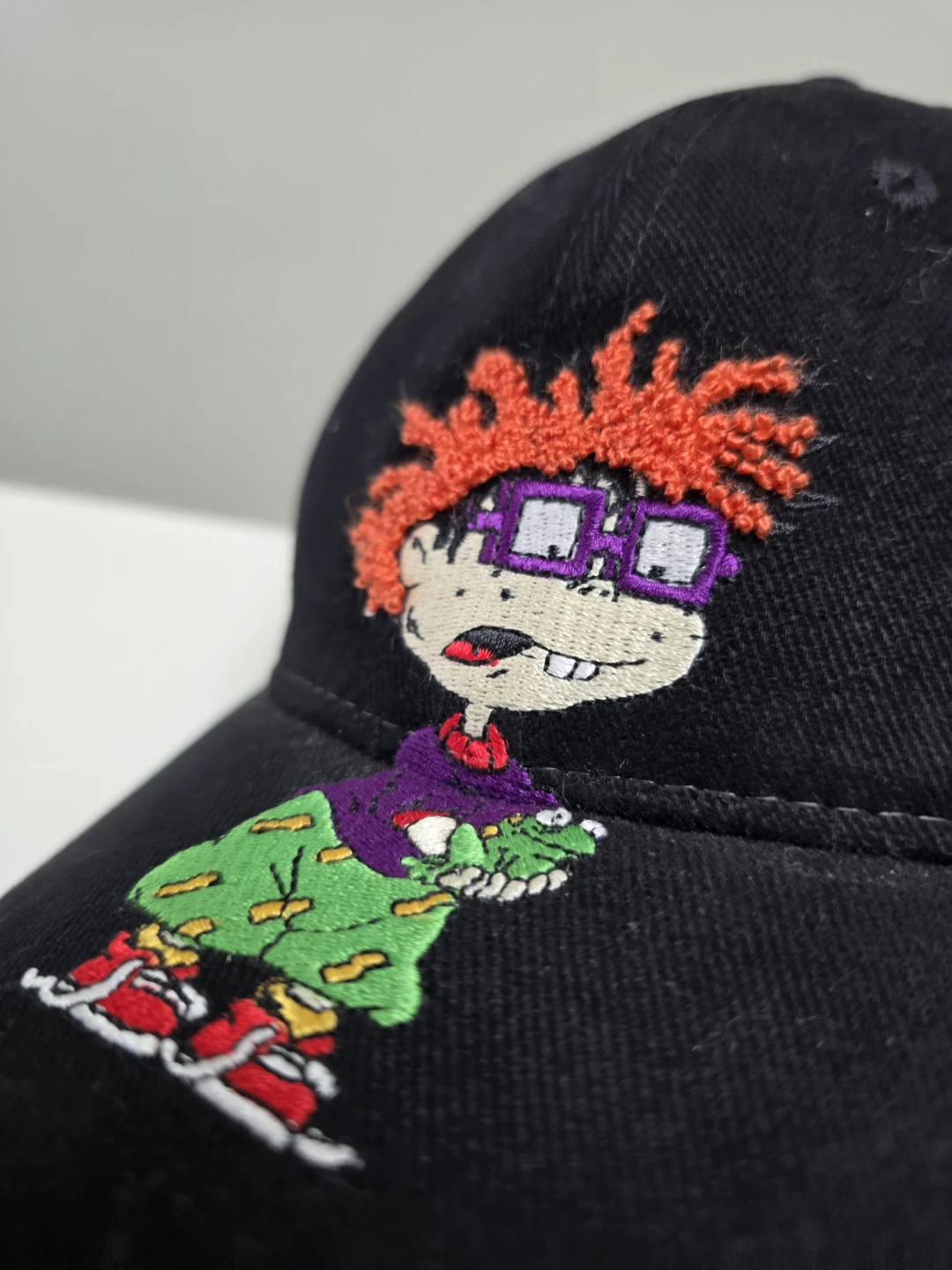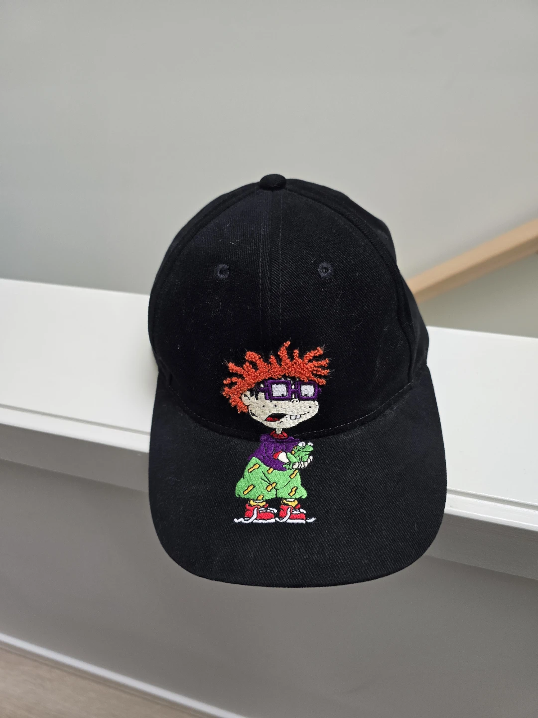 This black baseball cap features an embroidered Chucky from Rugrats. It's made of 100% cotton and is one size fits all.