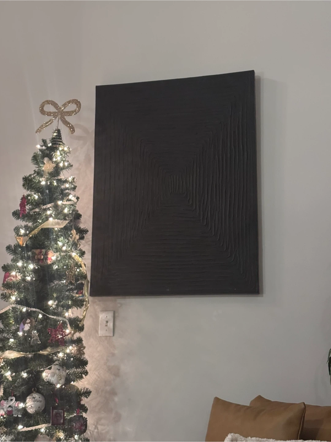 This is a piece of abstract wall art featuring a textured black square design. It adds a unique touch to any room!