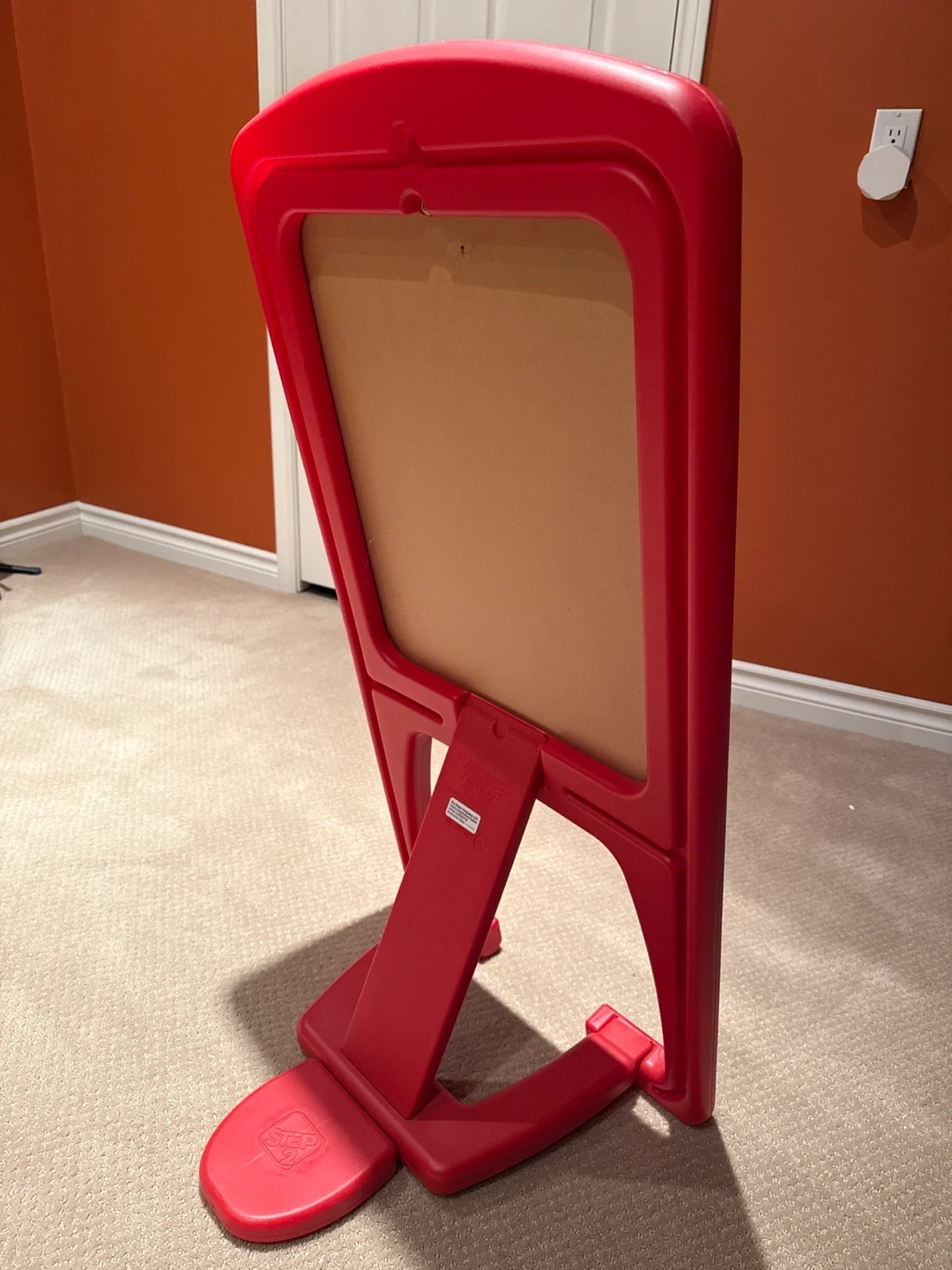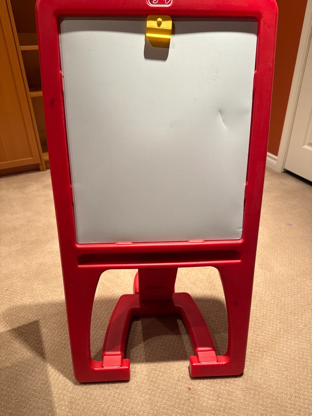 This red Little Tikes easel has a double-sided dry-erase board. It's perfect for kids to draw and create on. The sturdy base makes it great for active little artists. Built to last for hours of fun! Please note that there are no markers included with this item.